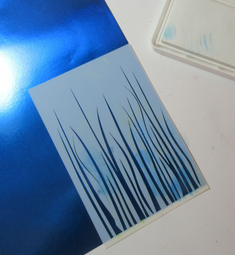 Placing the 4×6 Grass Stencil on the foil, I used Rinea Ghost Ink along both edges of the panel.