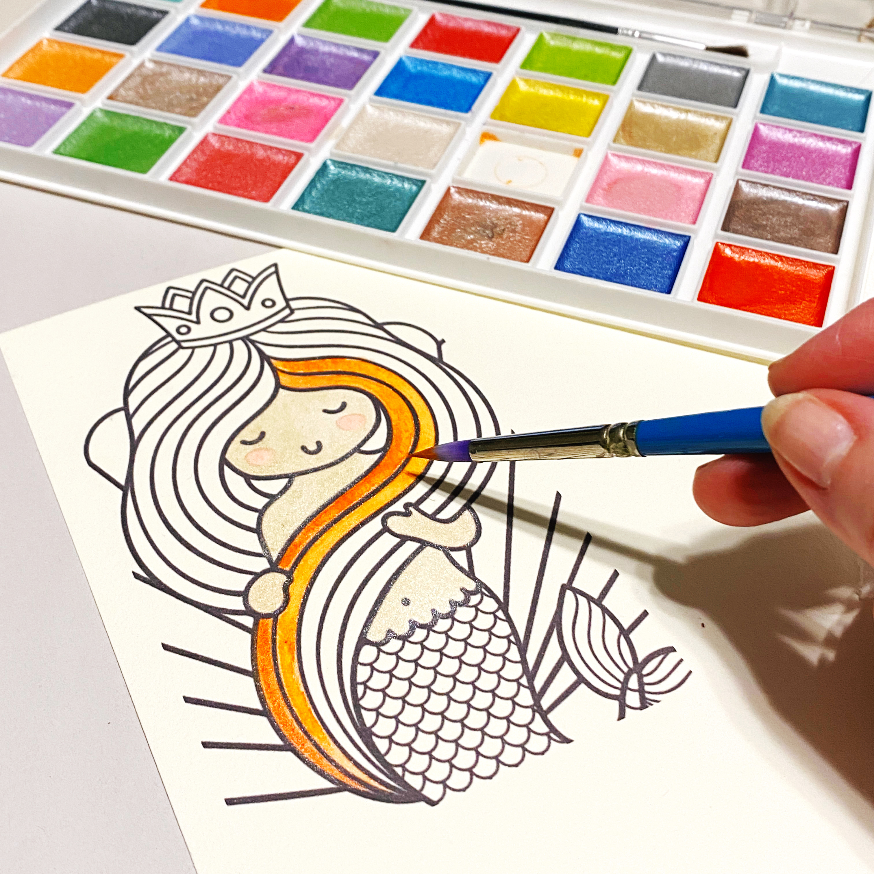 I started by printing out a portion of a coloring page (found online) onto watercolor paper, then I filled in the design with pearlescent watercolors I added accents to the crown using glitter gel pens…