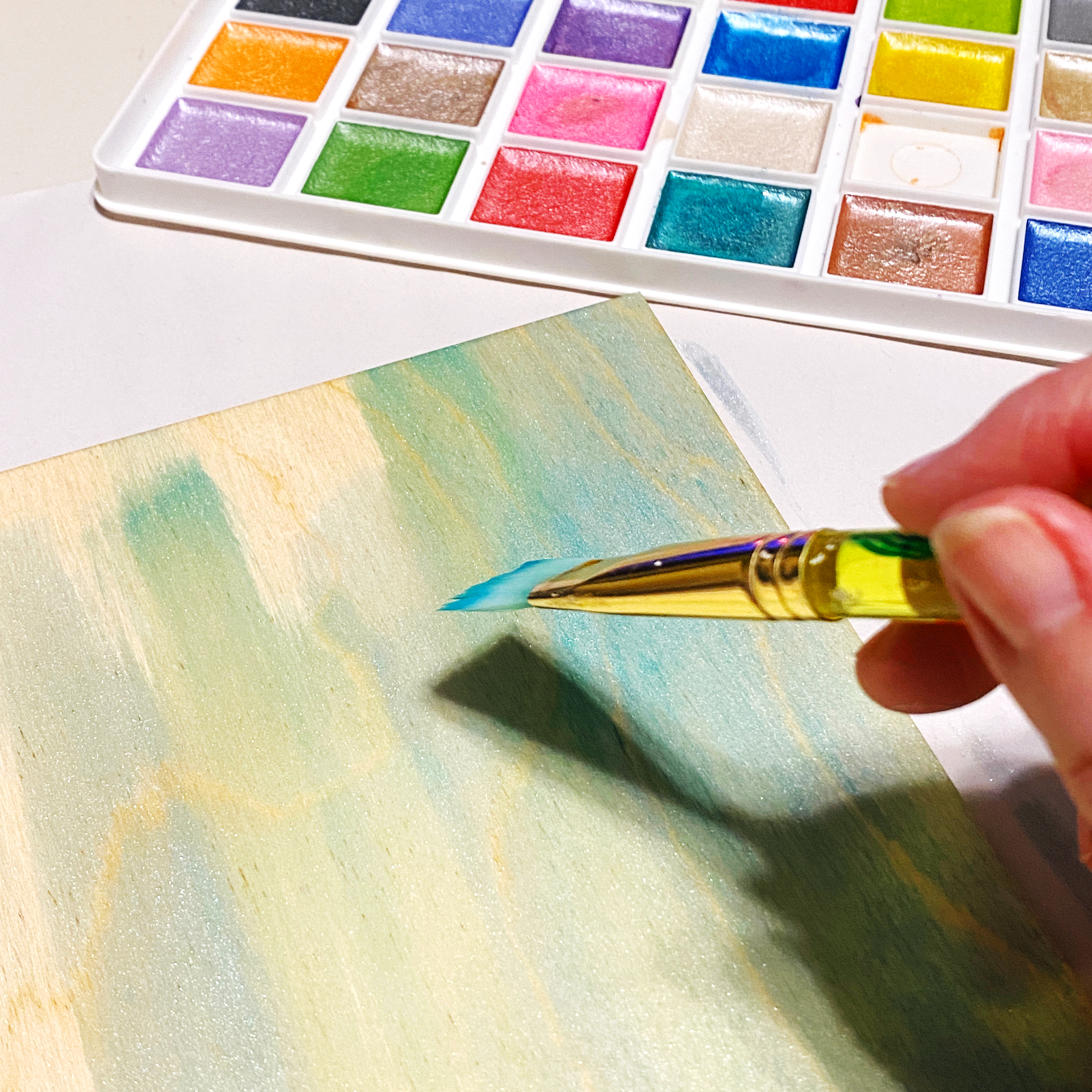 Then it was on to the background. I started with a Wood Rectangle, and painted it with 2 different shades of watercolors – the same colors I used for the Fin pieces…
