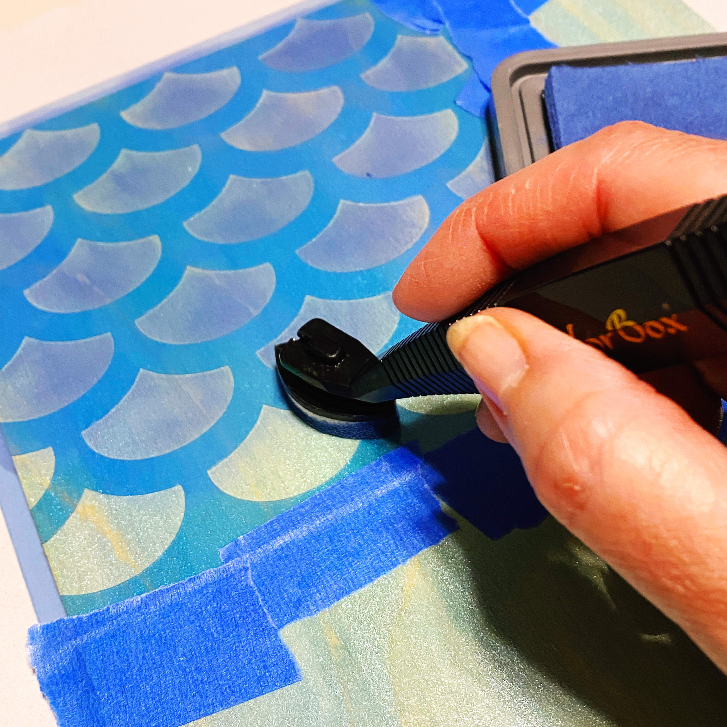 After the watercolors dried, it was time to stencil. I used blue painters tape to hold the Fishscales Stencil in place – I also taped off portions of the frame around the stencil as I needed to repeat the pattern over the whole board. Then I inked in the design with blue ink…