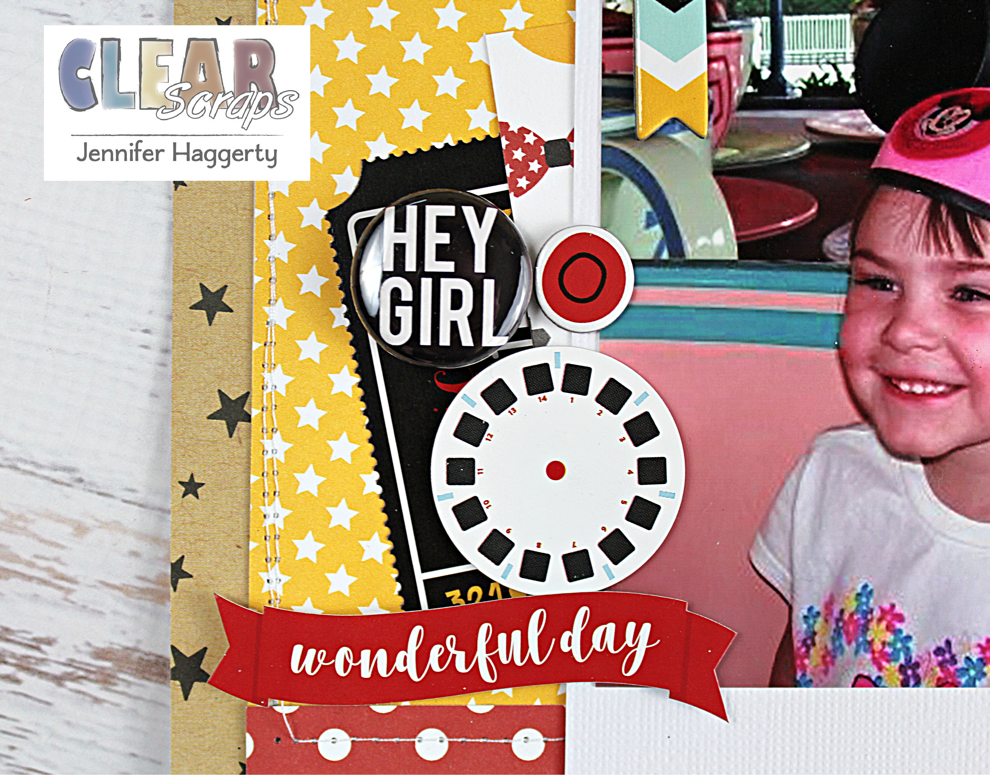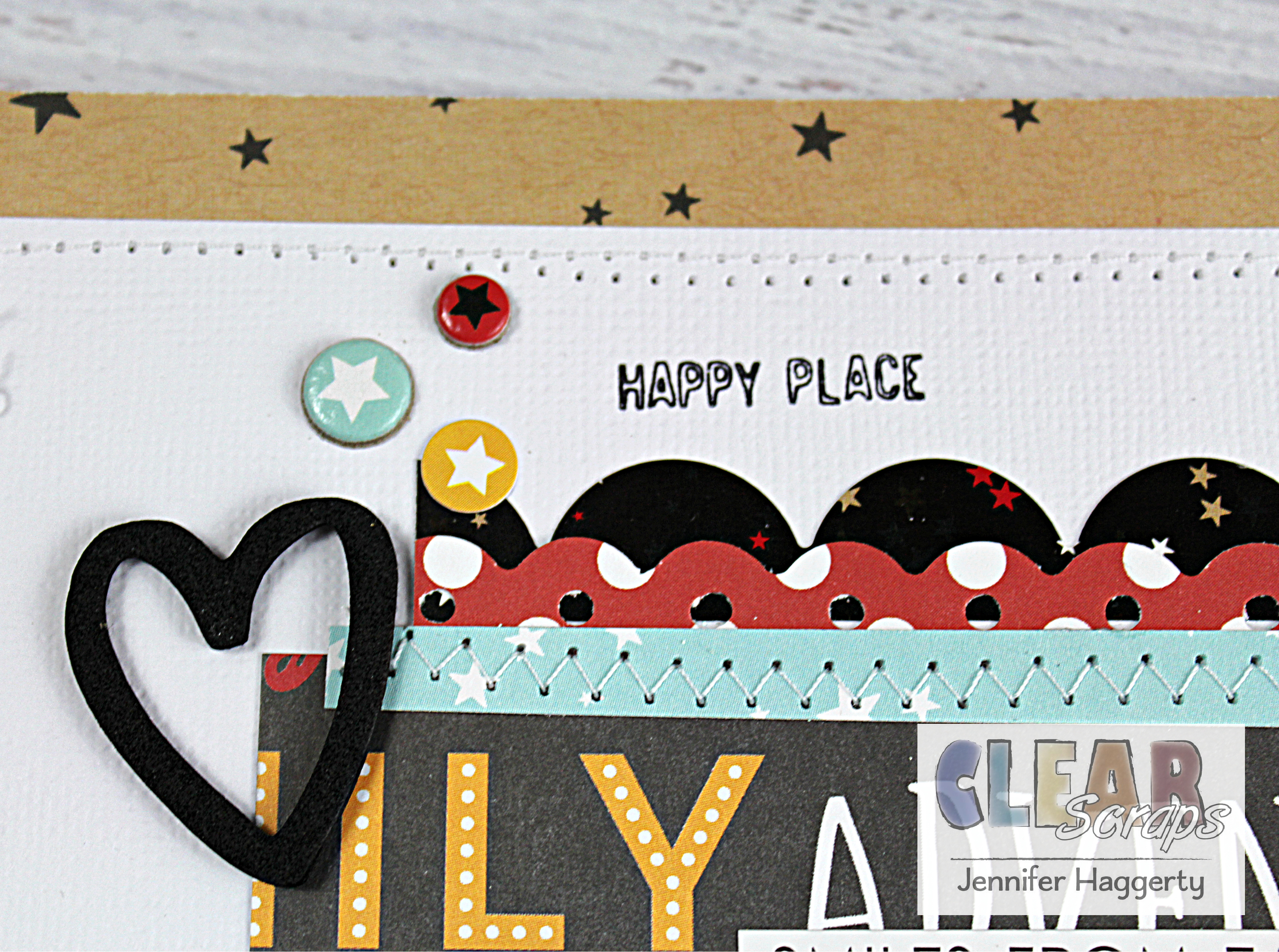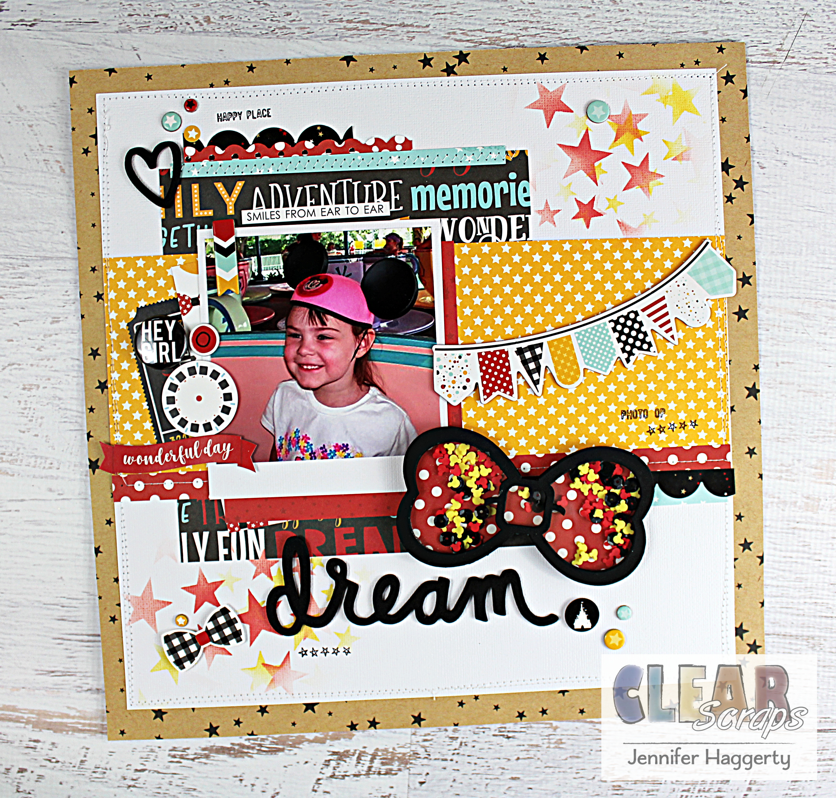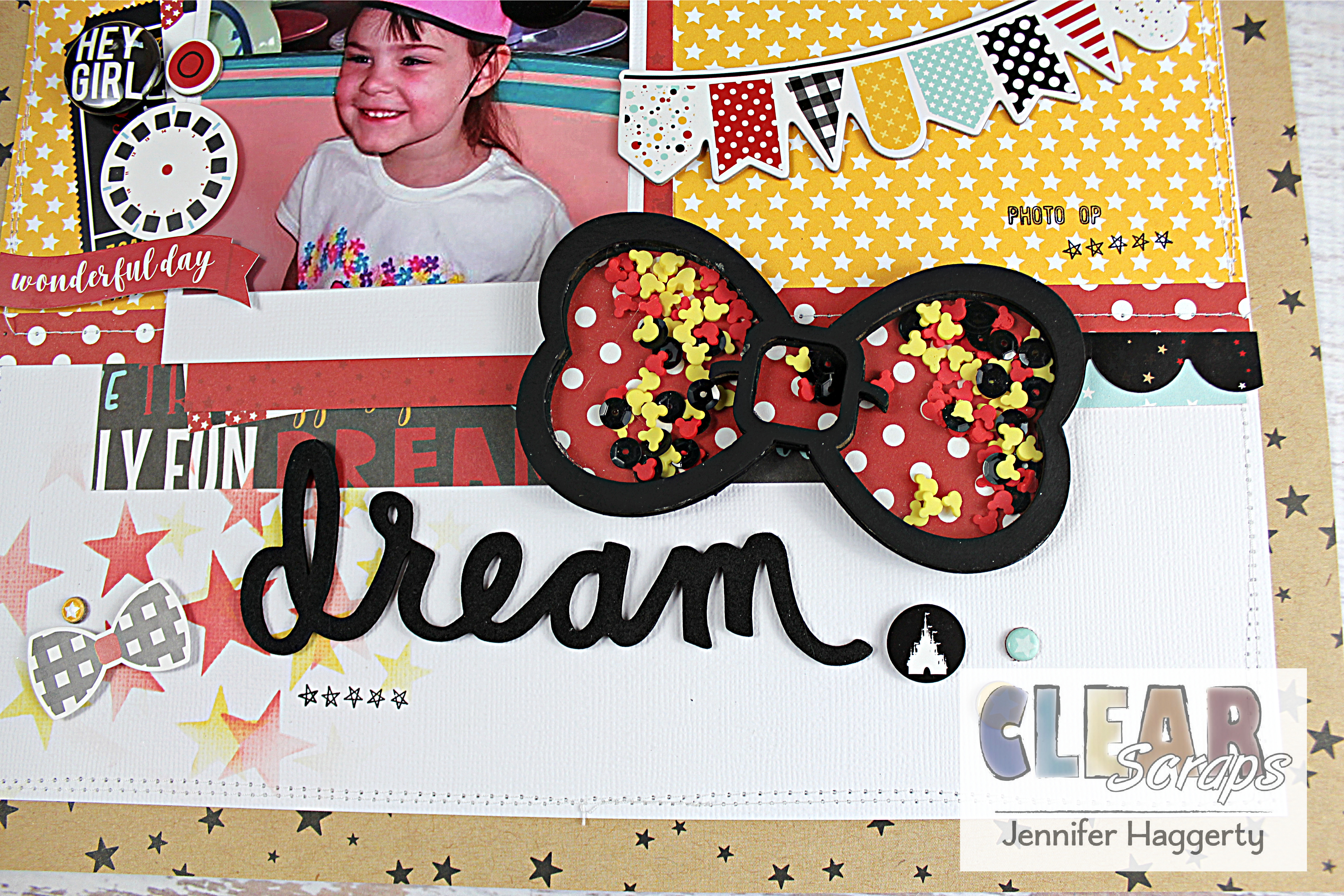 Hello friends and happy Friday! It's Jennifer on the blog today to share a layout I created using the new Bow Mini Shaker Shape! This cute embellishment can be used on girl-themed projects as well to accent your Minnie Mouse photos as I did here! I thought it would be perfect for one of my favorite pictures of my daughter in her Minnie ears at Disney!