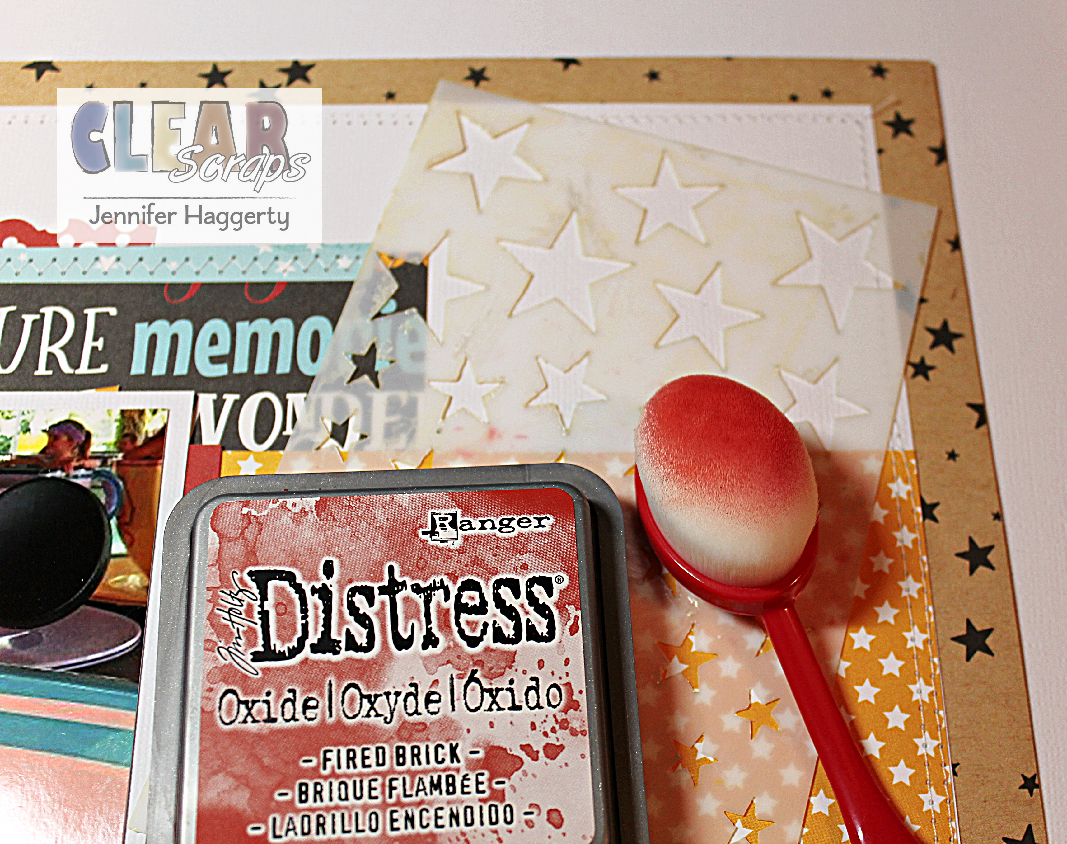 To add some extra color to my background, I used my 4×6 Stars Stencil along with Distress Oxide Inks in red and yellow.