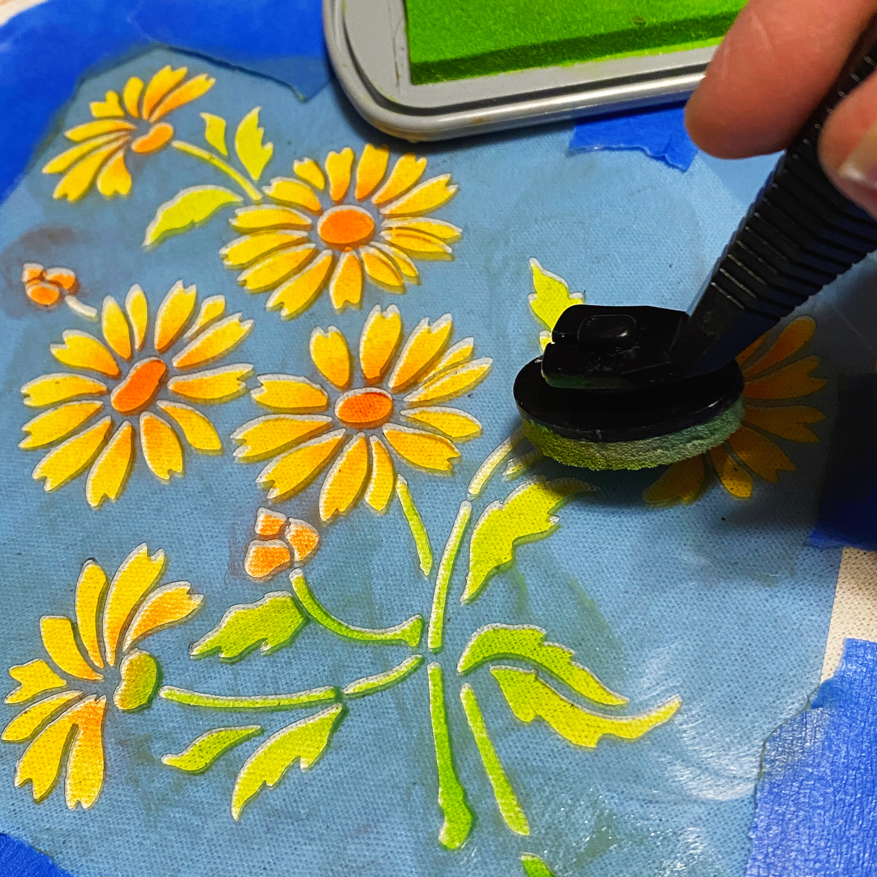 I put a piece of cardboard in the bag – so the ink wouldn't go through to the other side. then I arranged the stencil on the bag and taped it down using blue painters tape. I also taped off the areas beside the stencil where the design was close to the edge. This prevents accidental inking off the edges…