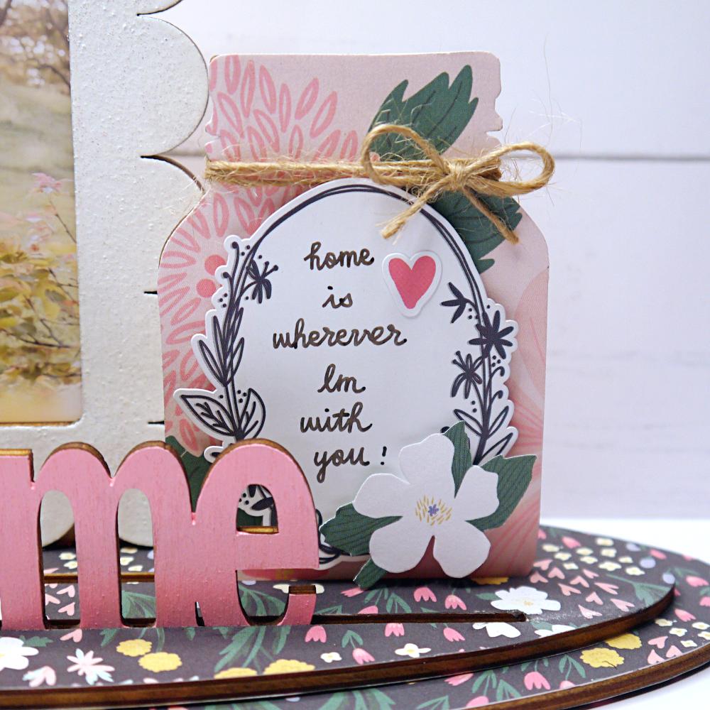 ▼ For the jar wood shape, I decided to cover it with a floral patterned paper and decorated it with some stickers. I also wrote down "Home is wherever I'm with you" with a black pen and tied a bow using a piece of twine for a finishing touch.