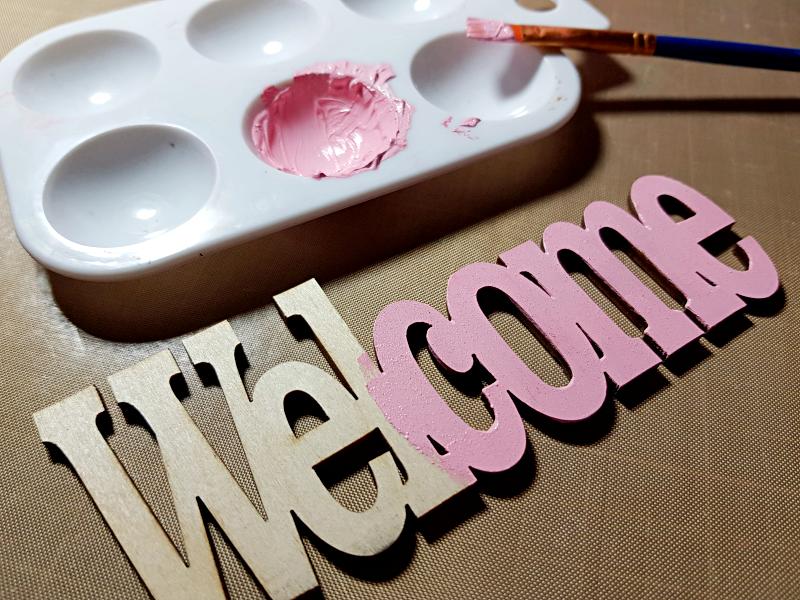 ▼ Here I painted the wood word welcome with acrylic paint in pink.