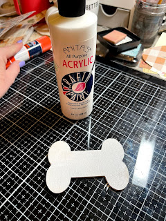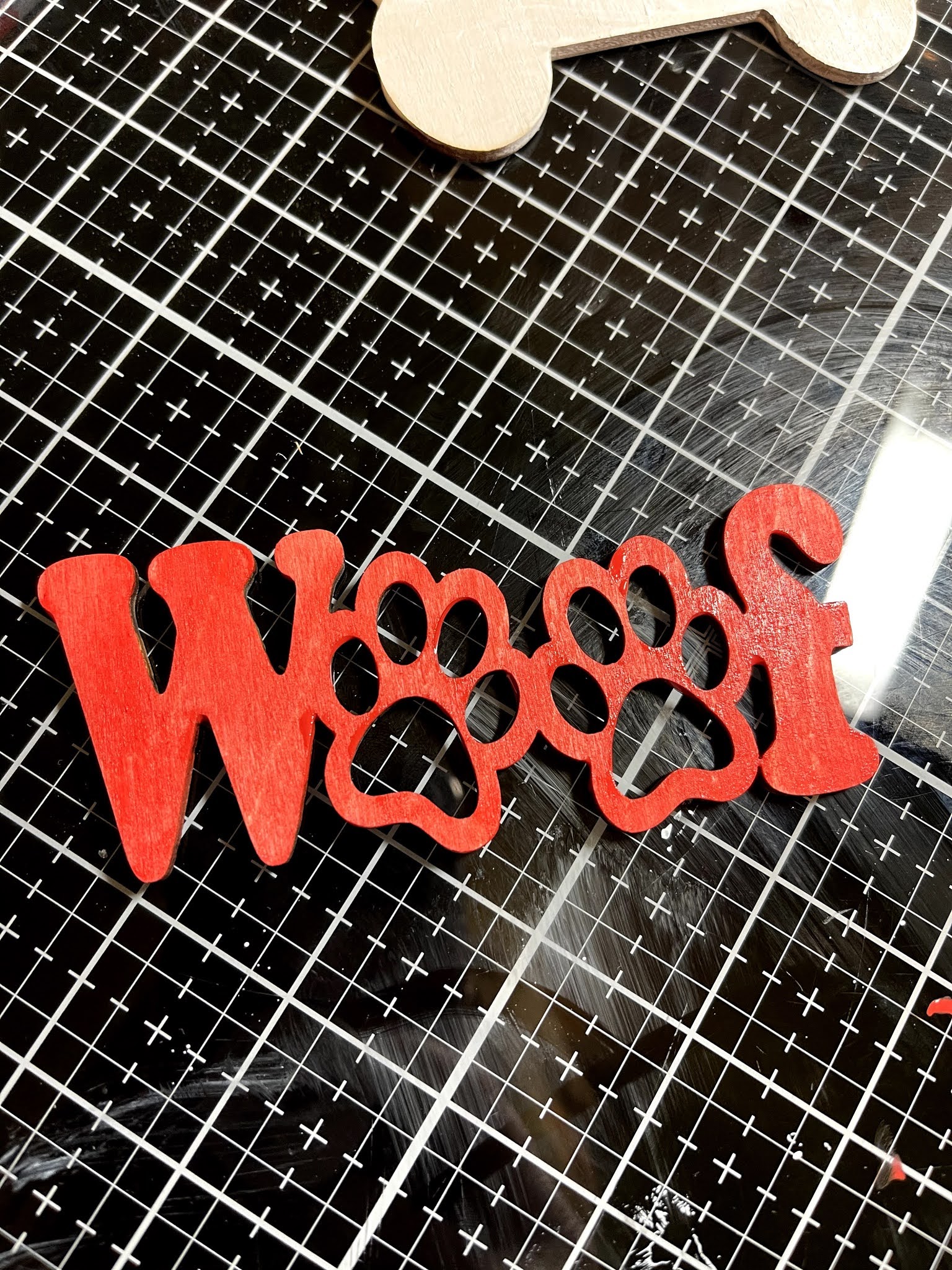 Start by painting your dog bone in white and the Woof in red. Set aside to dry!