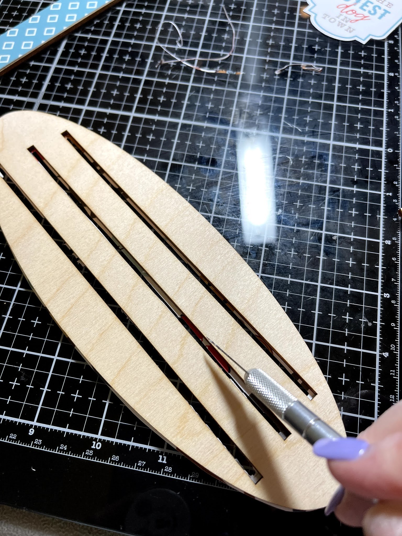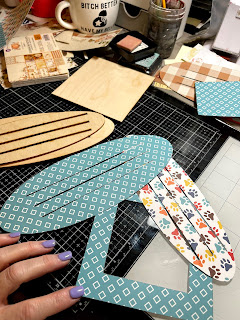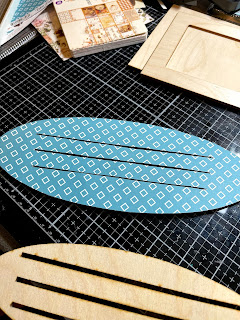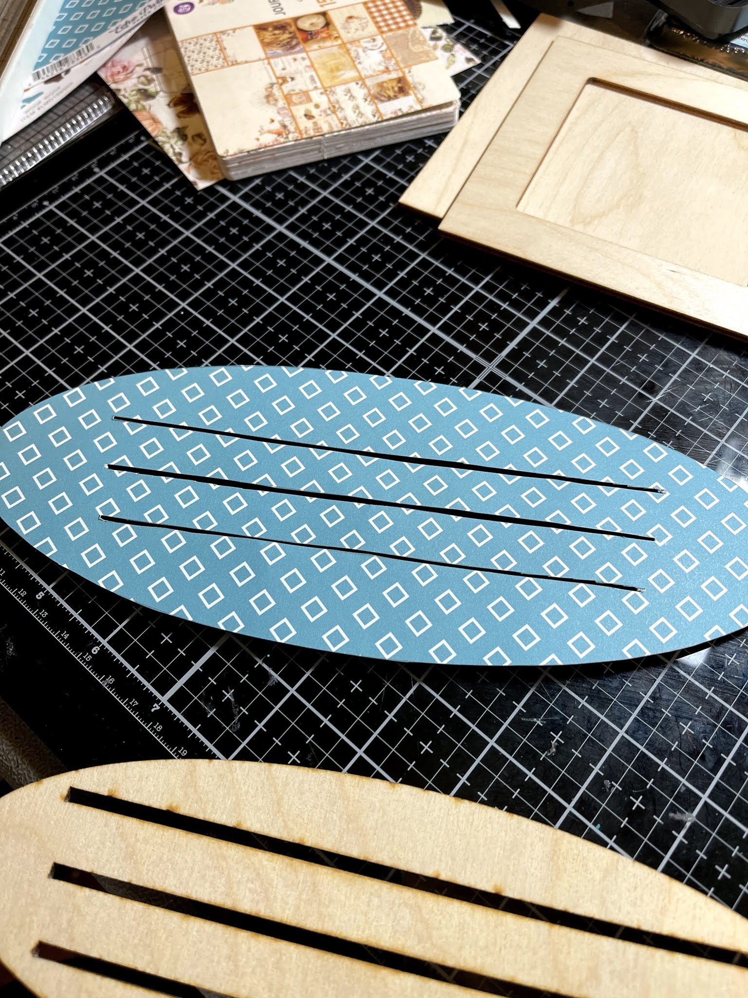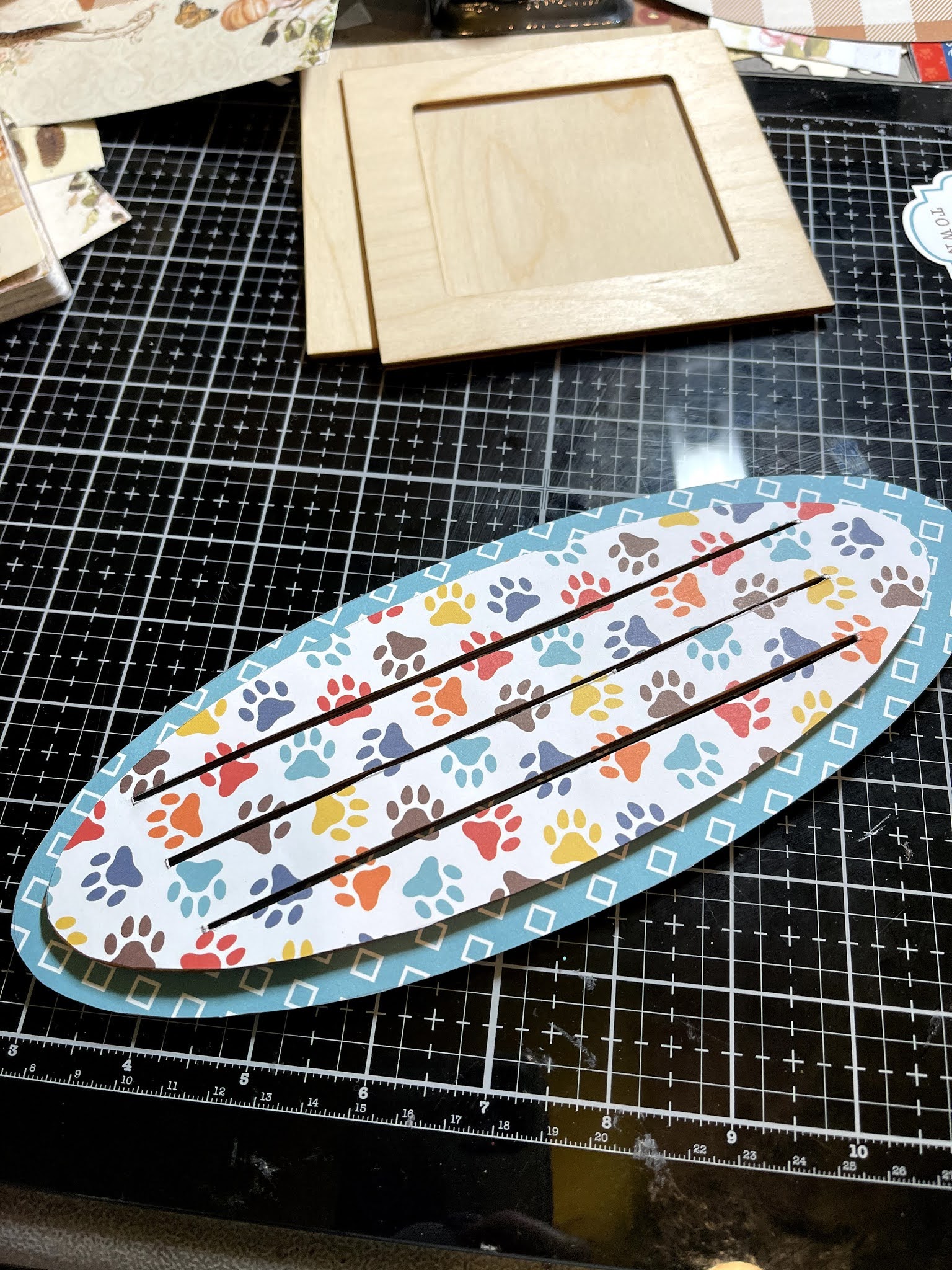 Trace bases and frame onto patterned paper and cut out. B sure to cut slots in your base papers.