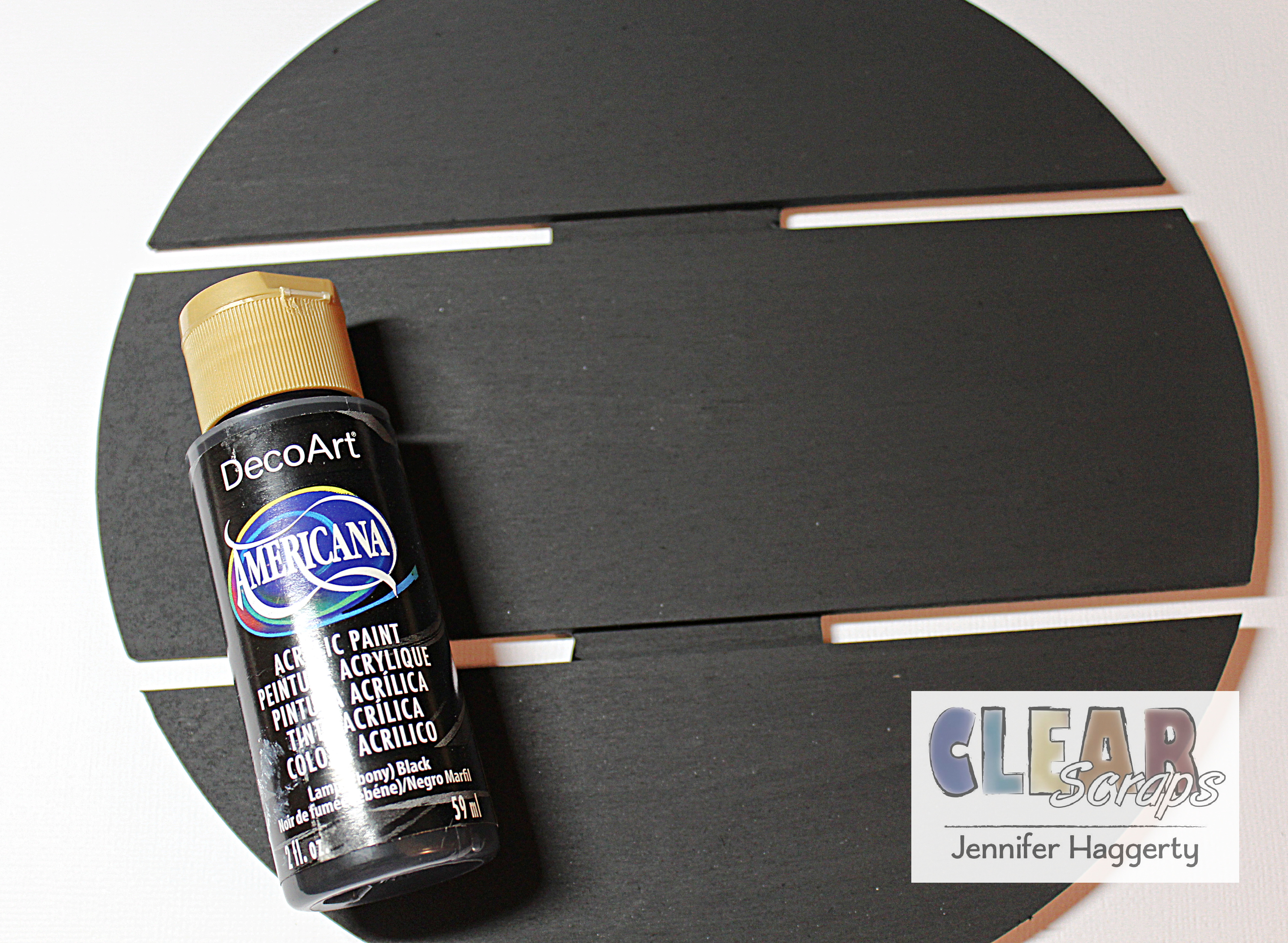 I began with the Circle Medium DIY Pallet Shape and painted the front using black acrylic paint. I made sure I added paint to the outside edges as well as in between the slats.