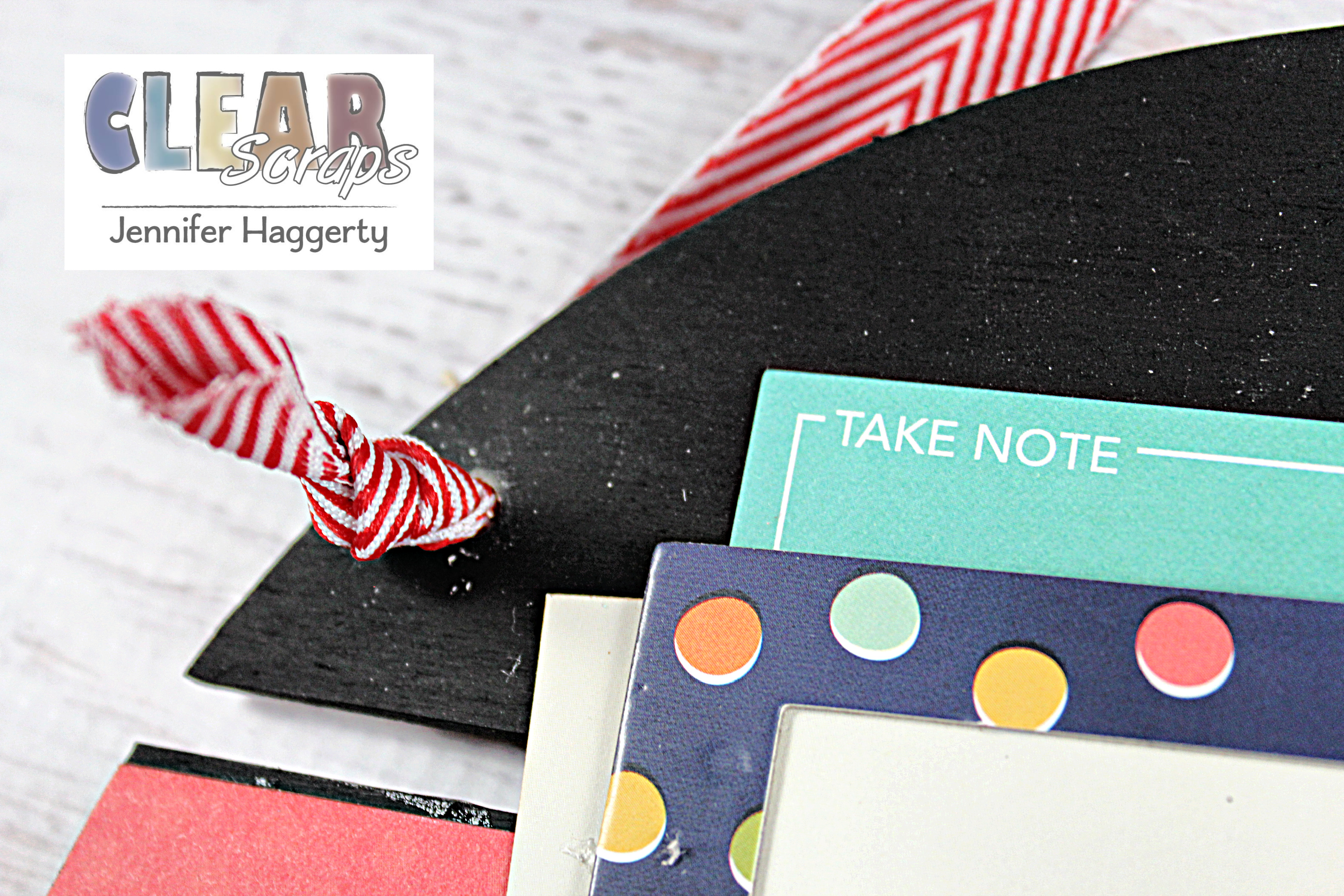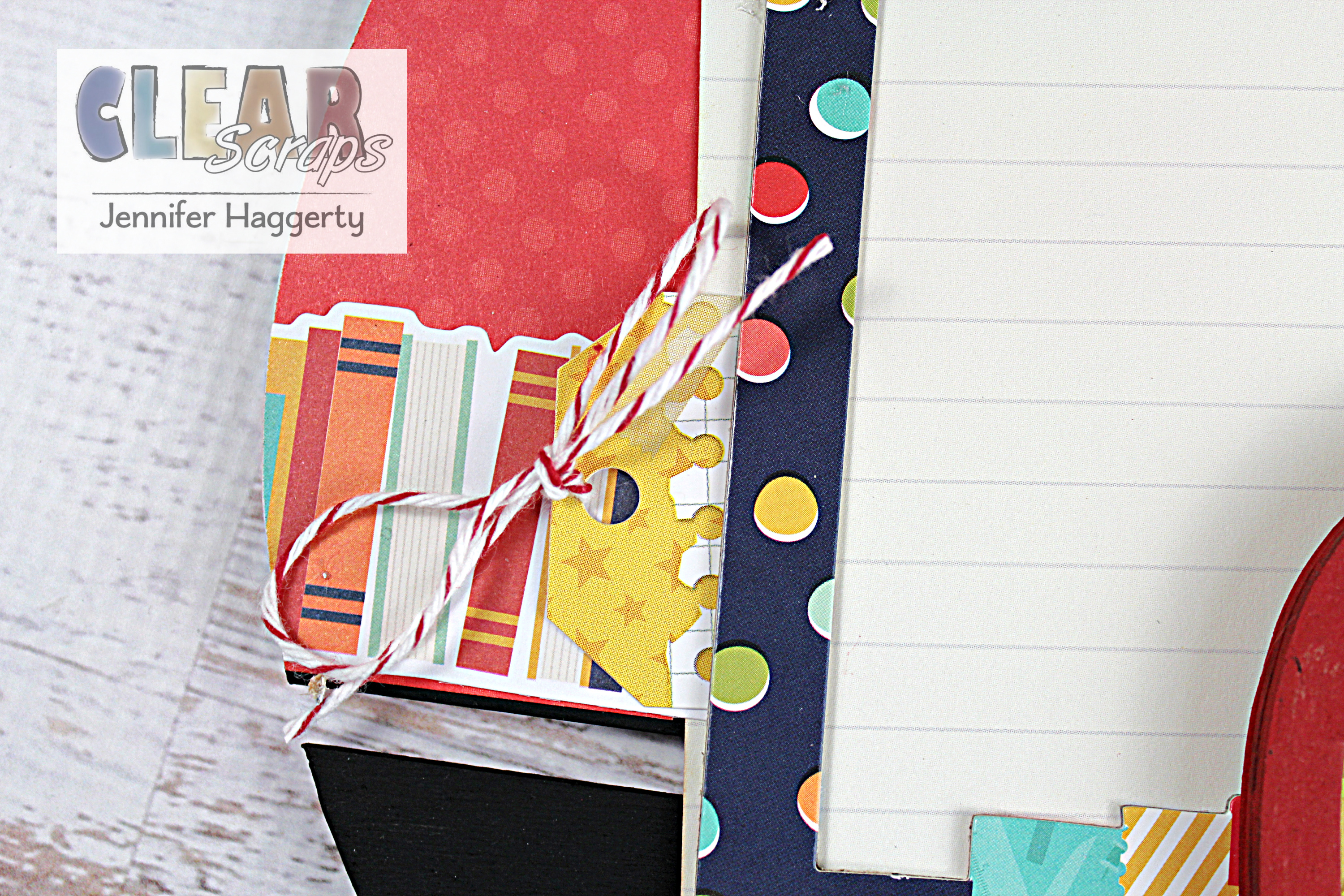 Using my Beacon 3-in-1 Adhesive, I affixed school themed patterned paper to the front of the chipboard base. I cut away excess paper with scissors followed by using an x-acto knife and sanding tool (FYI, you can purchase this same sanding tool through the Clear Scraps shop).