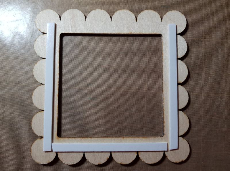 ▼ For the wood frame, I gave it a coat of embossing powder by using a watermark ink pad, detailed white embossing powder and a heat gun. Then, I applied 0.25 inch double-sided foam tape on the back of the scallop frame to adhere to the back frame, so a photo can slide into the frame.