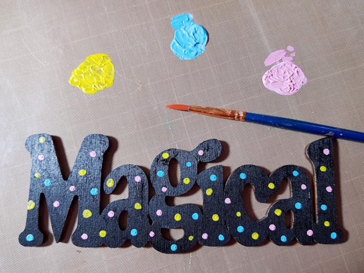 ▼ For the magical word shape, I painted it with acrylic paint in black. After the black paint dried, I also added some dots with bright yellow, blue and pink colors using a paint brush for extra touches.