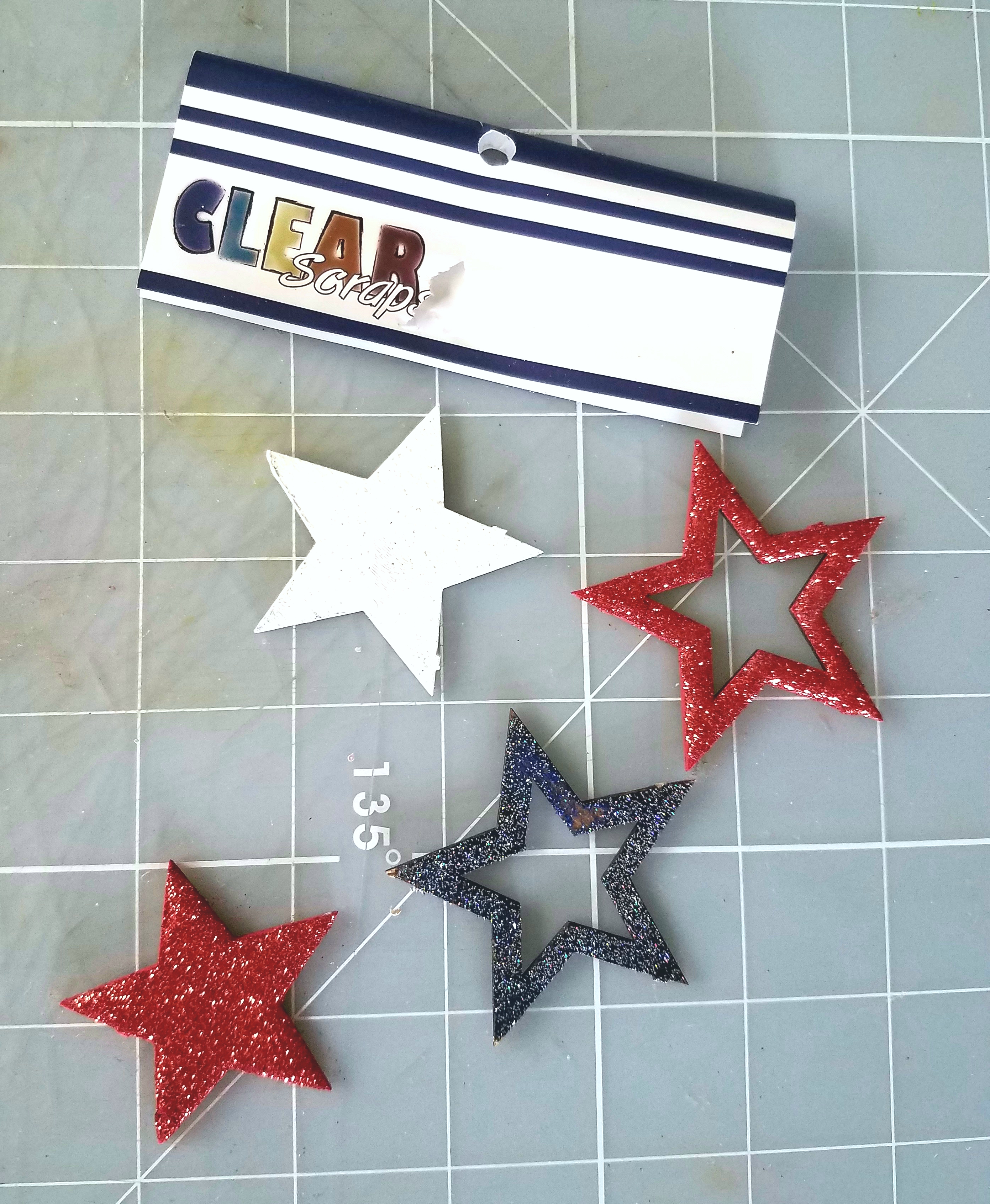 We will start by cutting apart our multi stars and save the chipboard frame piece for another project. I used acrylic paint in white for one of my stars. The red and blue stars I inked with Versamark clear ink and added red and blue embossing powers on top. Heat with your heat tool. Set them aside.