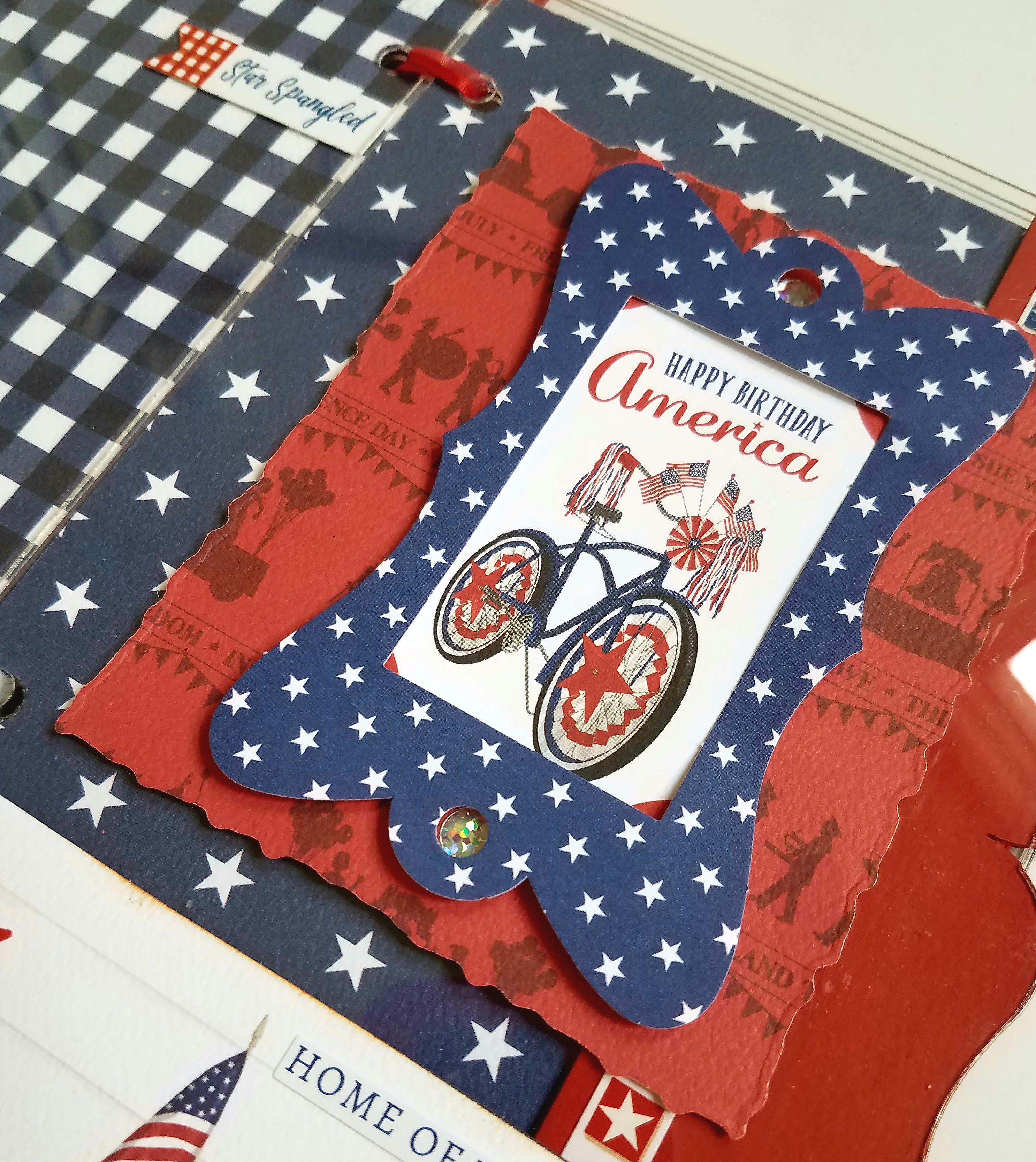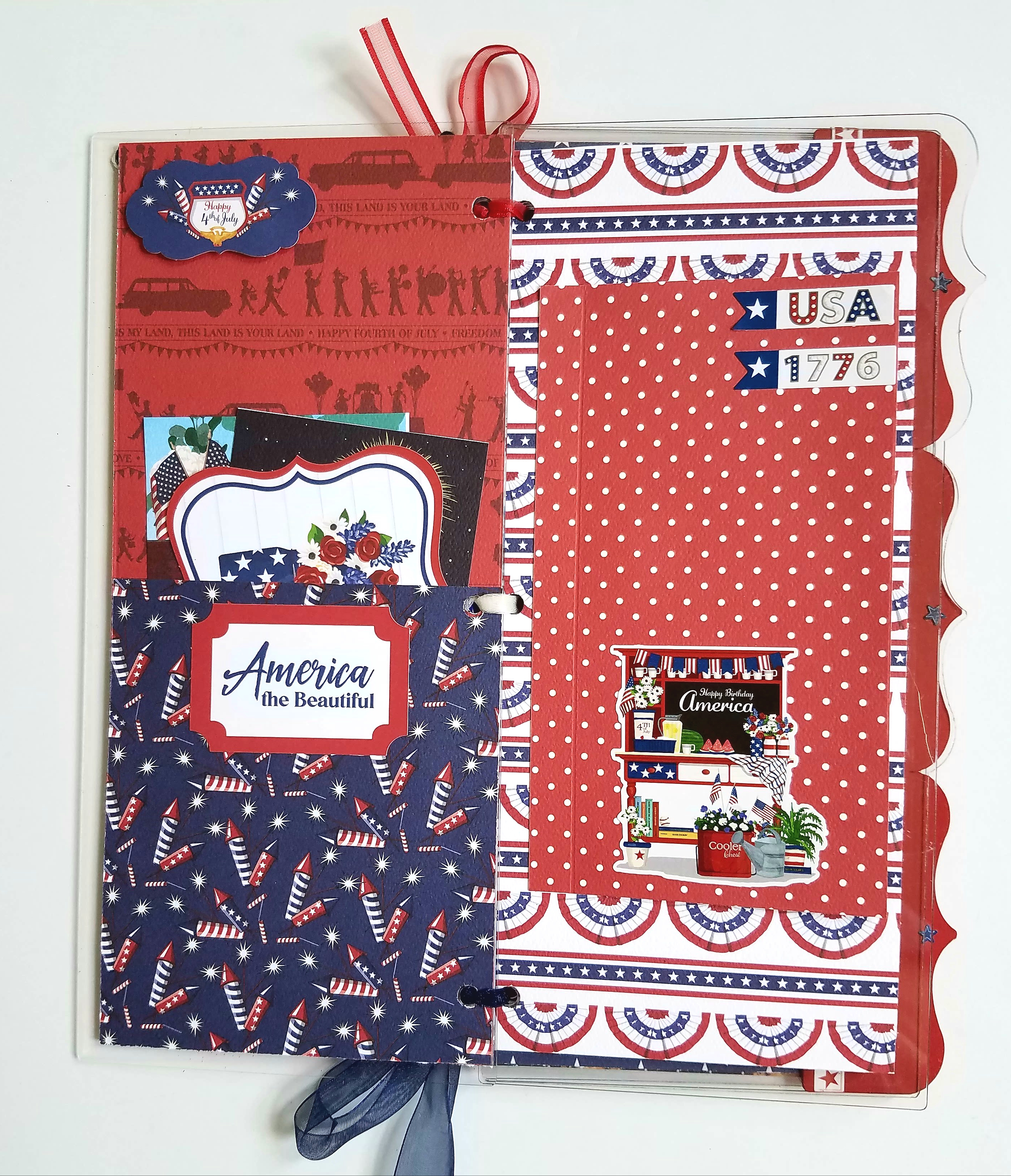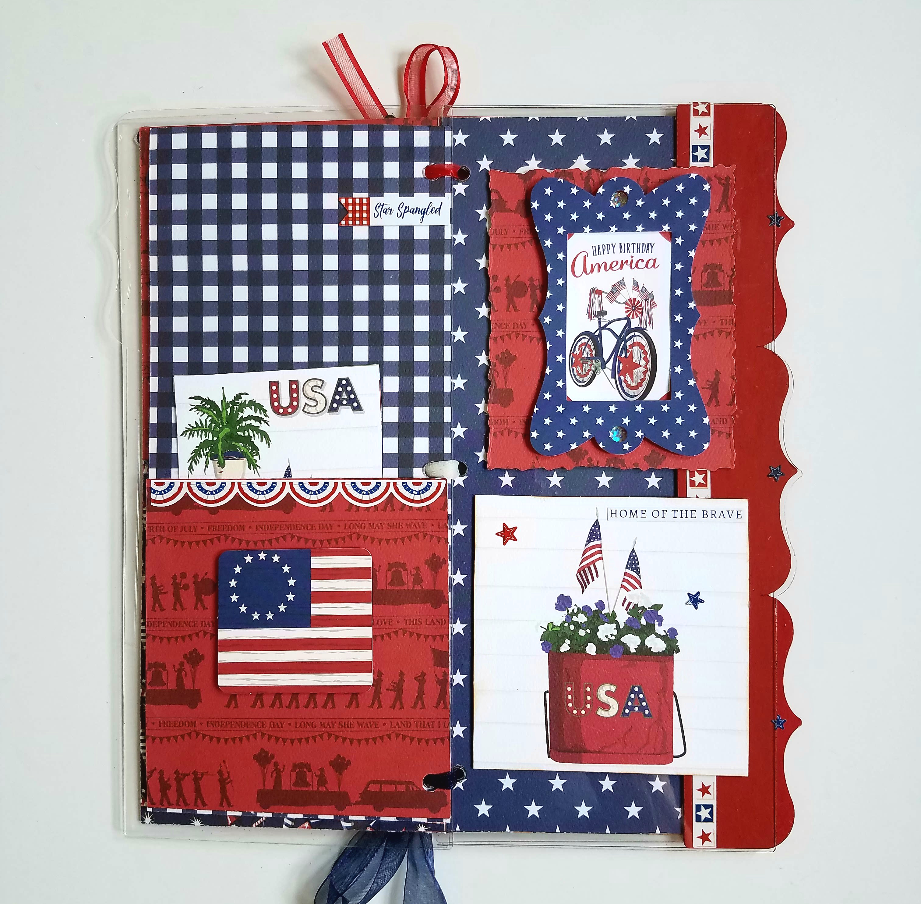 For the last two pages, I cut both papers at 4 5/8 x 10 5/8. For page 7, I cut my paper at 3 3/4 x 6 1/2 inches. I scored 1/2 inch at the top to make a flip up page. I added a sticker at the bottom of my flip page with foam dots. I love the added dimension it creates. Page 8, I cut my paper 4 1/2 x 7 inches and adhered in the middle of my page. The paper that shows through is your back cover paper. I added some USA stickers to the bottom of page with foam dots.