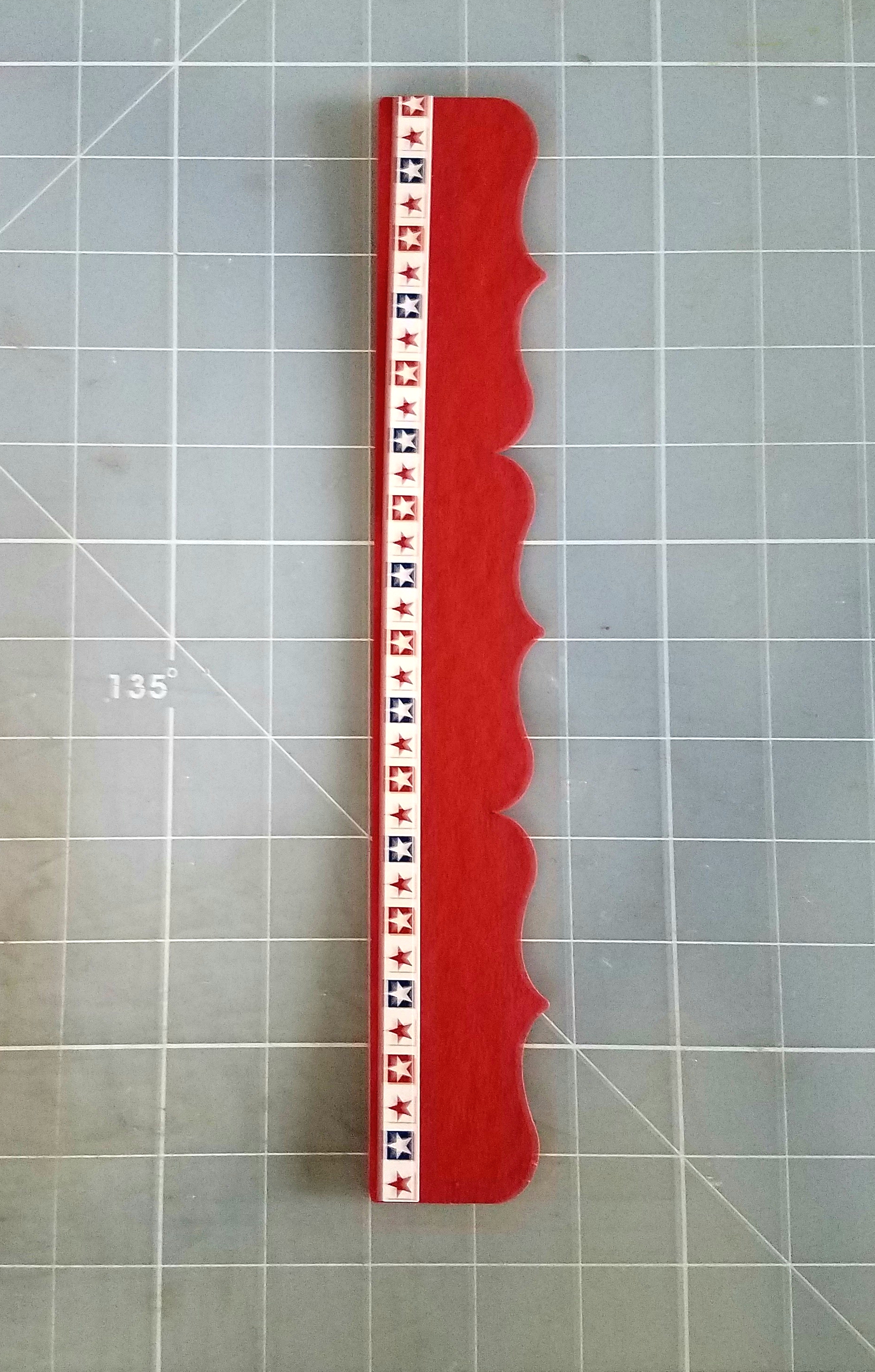 Page 5, I adhered a journaling card over the previous journaling card. For page 6, take and cut apart one of the Deco Chipboard borders. You can save the other border for another album or project. I painted my border with bright red acrylic paint on both sides. Let dry. Then I added a sticker border to left edge and a few stars on the right side.