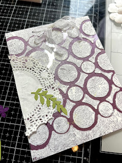 Card base, Card stock, paint, Flower die cuts, leaf punches, Paper Doily, ribbon
