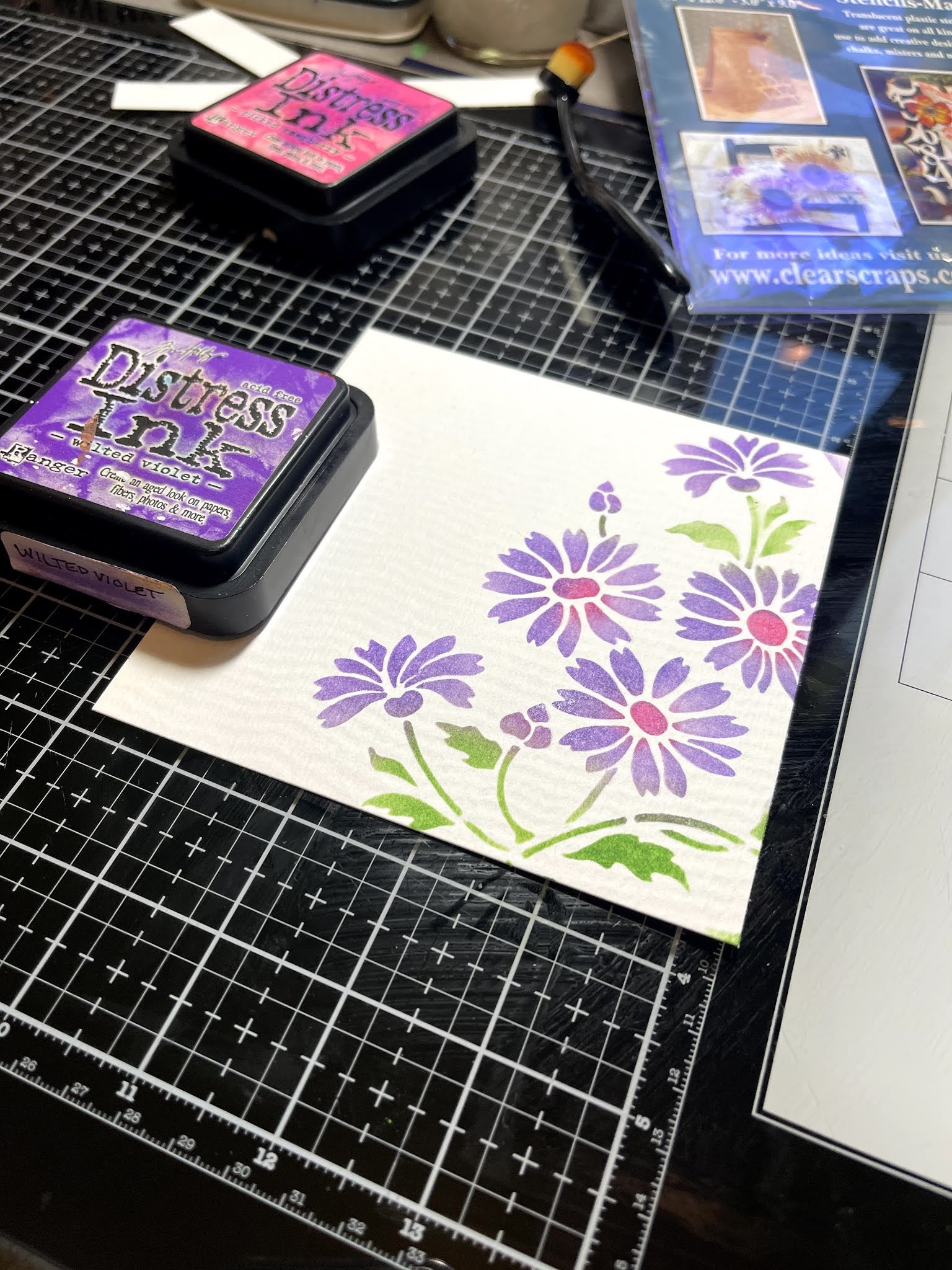Ink flowers with distress ink. Here I chose purples to coordinate with my pink flower centers!