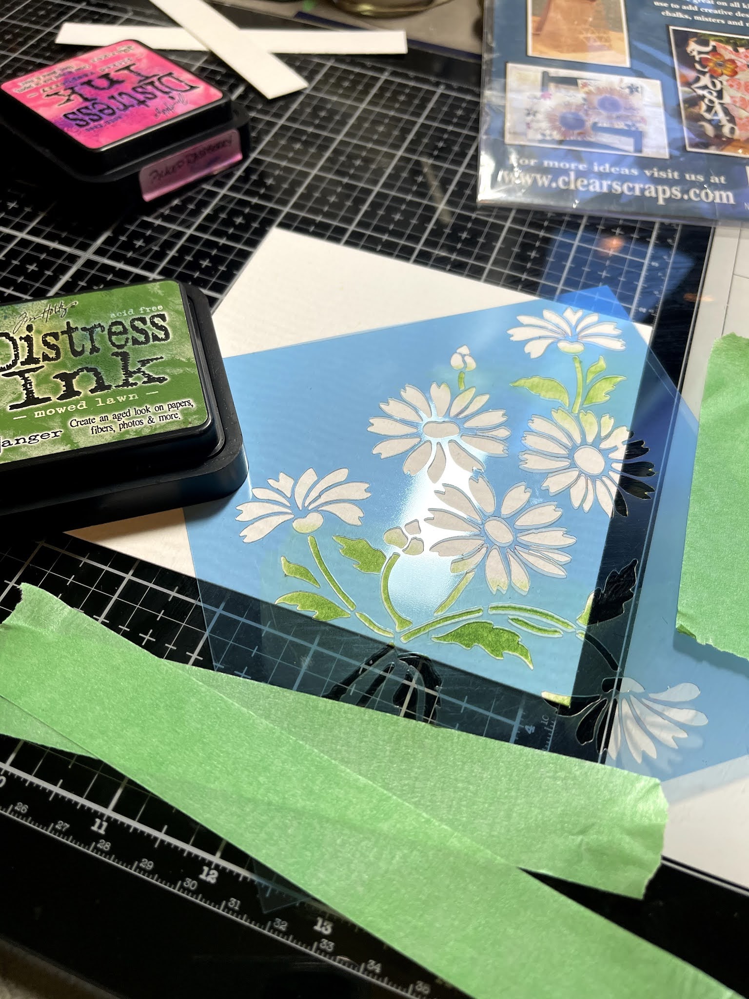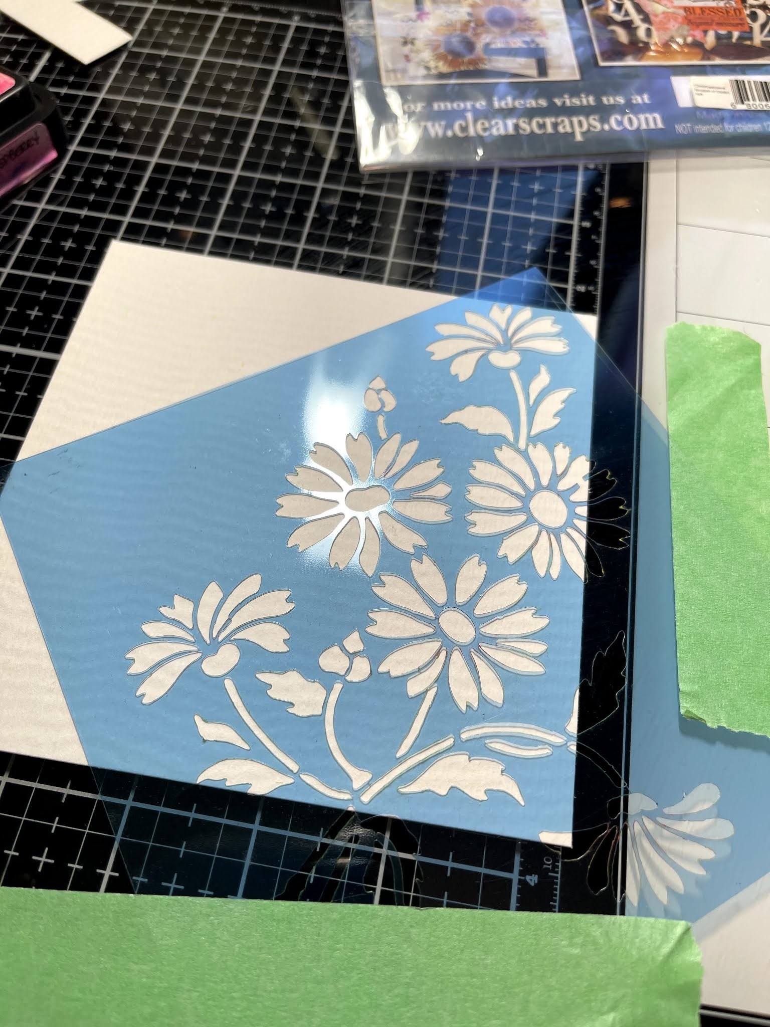 Start by securing your watercolor paper to your work surface. Secure your 6 inch Bouquet of Daisies Stencil over your paper. I chose to use my stencil on an angle.