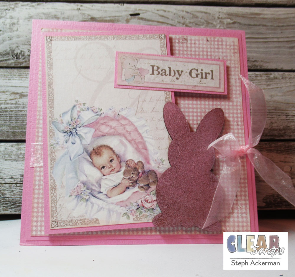 Creating a card from pink cardstock, I matted the checked panel with the same cardstock and wrapped it with ribbon. The baby panels were also matted with cardstock and added to the card with foam adhesives for dimension. The pink bunny was adhered just below the Baby Girl tag.