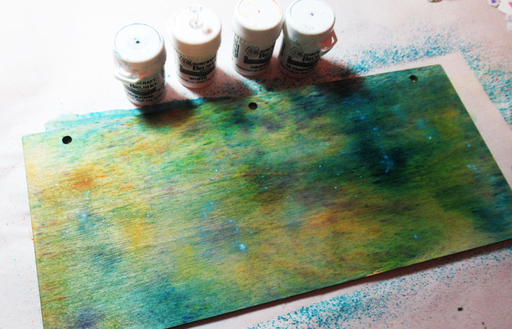 I started by spritzing the covers with water, then adding assorted colors of Brushos Color Crystals to create the background.