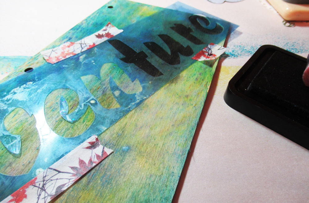 Once dry, I taped the Adventure Stencil on an angle on the front cover and started inking the stencil with black ink.