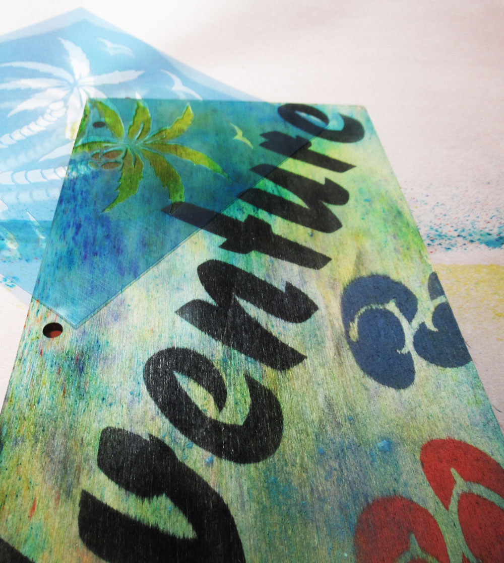 Place the 6" Beach Fun Stencil on the front cover and ink the flip flops with different colors of ink. Next, place the 6" Summer Palms Stencil in the upper corner and ink with green and brown inks.