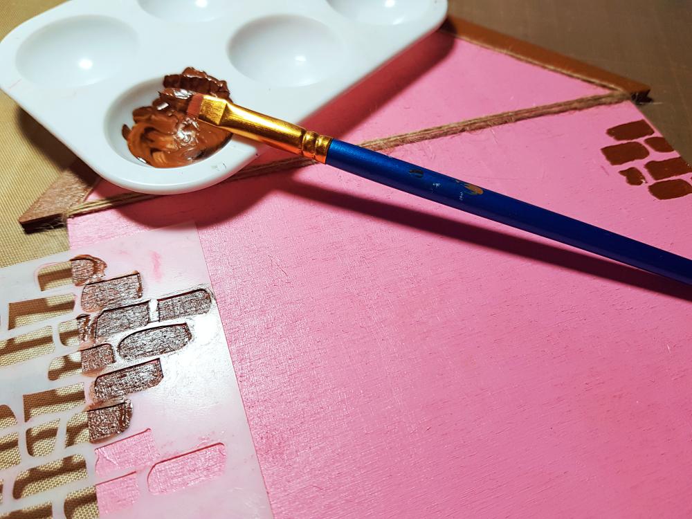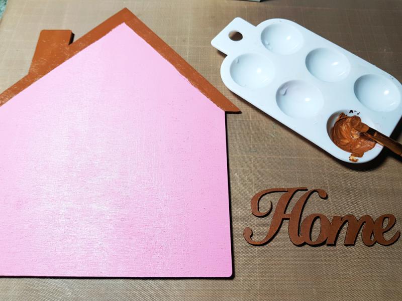 ▼ I began by painting the house shape and the Home word title with acrylic paints in pink and brown.