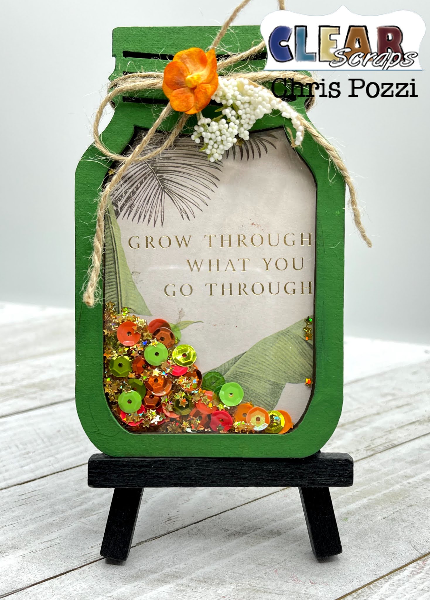 Finish your shaker by tying a jute bow around the top of the shaker and add flowers. I hope you are inspired to get creative with your Clear Scraps Shakers.