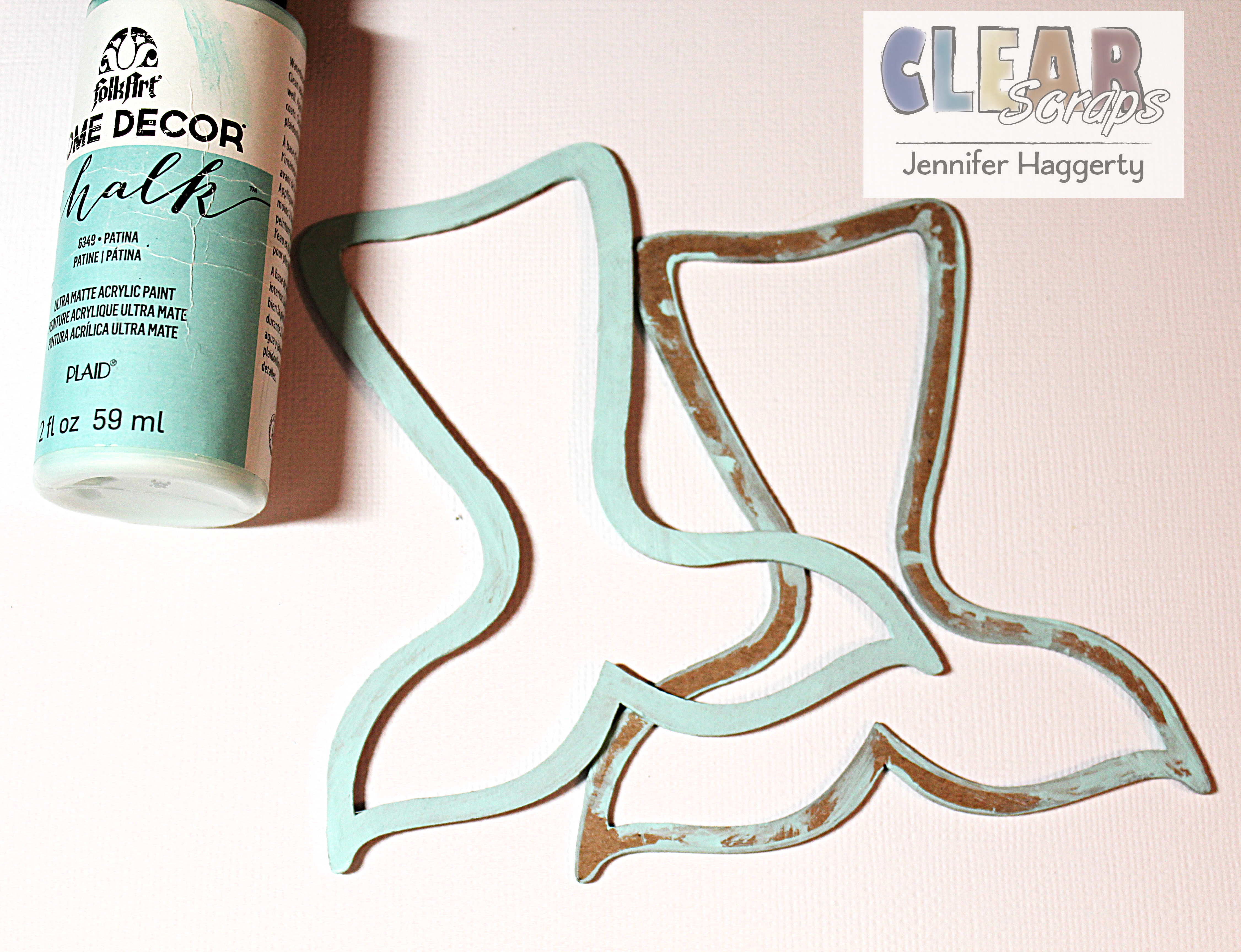 I began by painting my top chipboard frame of the shaker using chalk paint in a patina color. Chalk paint isn't necessary but it does dry quickly. And I just happened to love this color for my page! I also painted the inside edges of the middle chipboard frames as well.