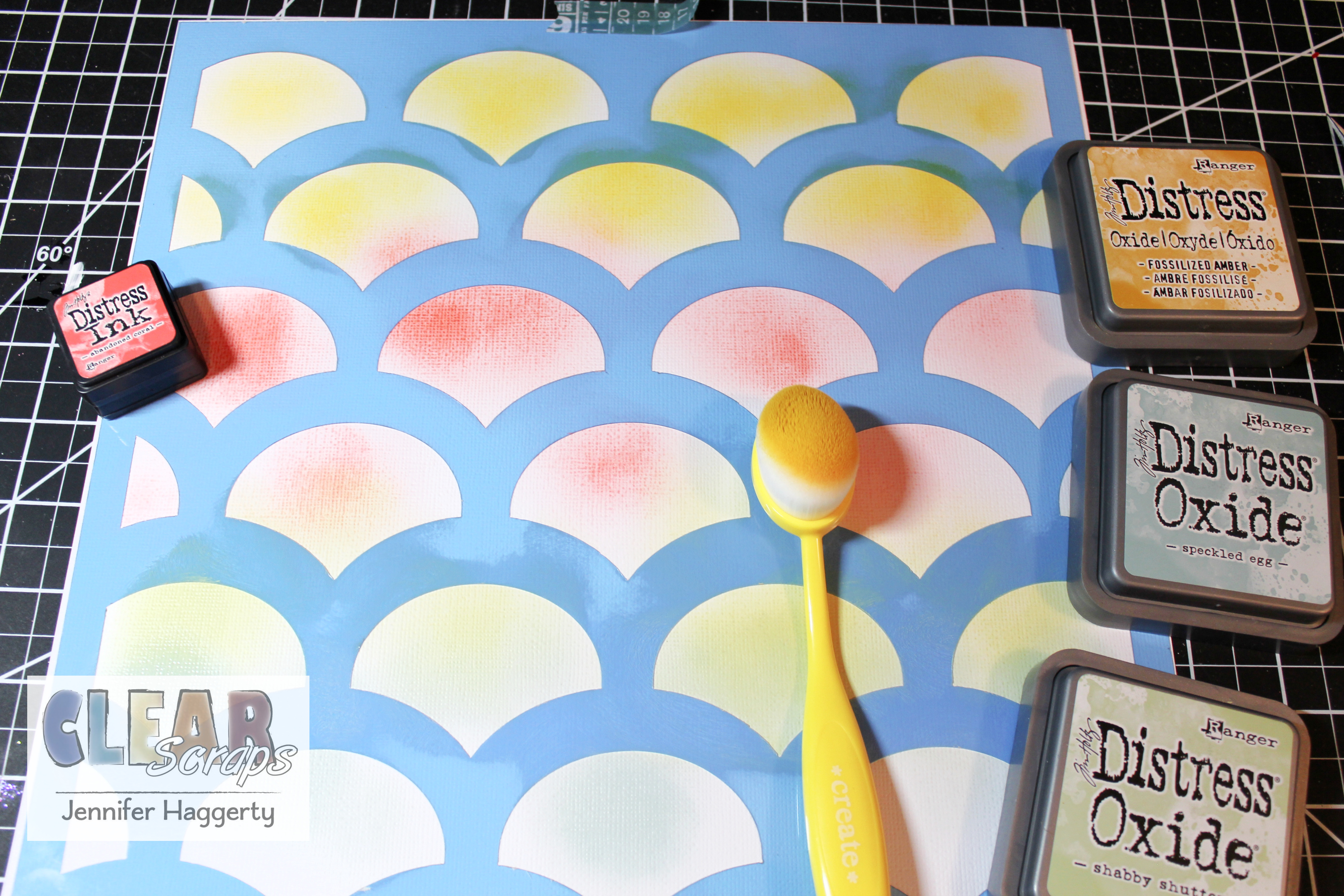 For my background, I secured the 12 Inch Fish Scales Mascil to my 12×12 white cardstock with washi tape. I then blended four different Distress Oxide Inks as shown.