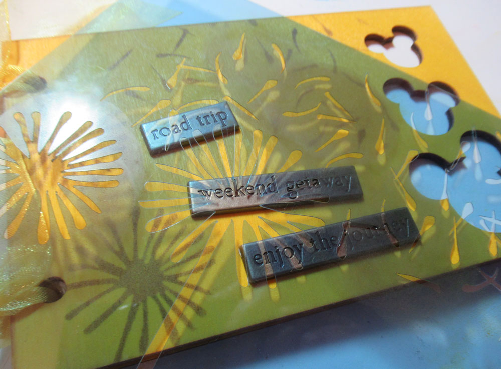 Placing the 6" Dandelion Wind stencil on the front cover, I inked portions with brown ink.