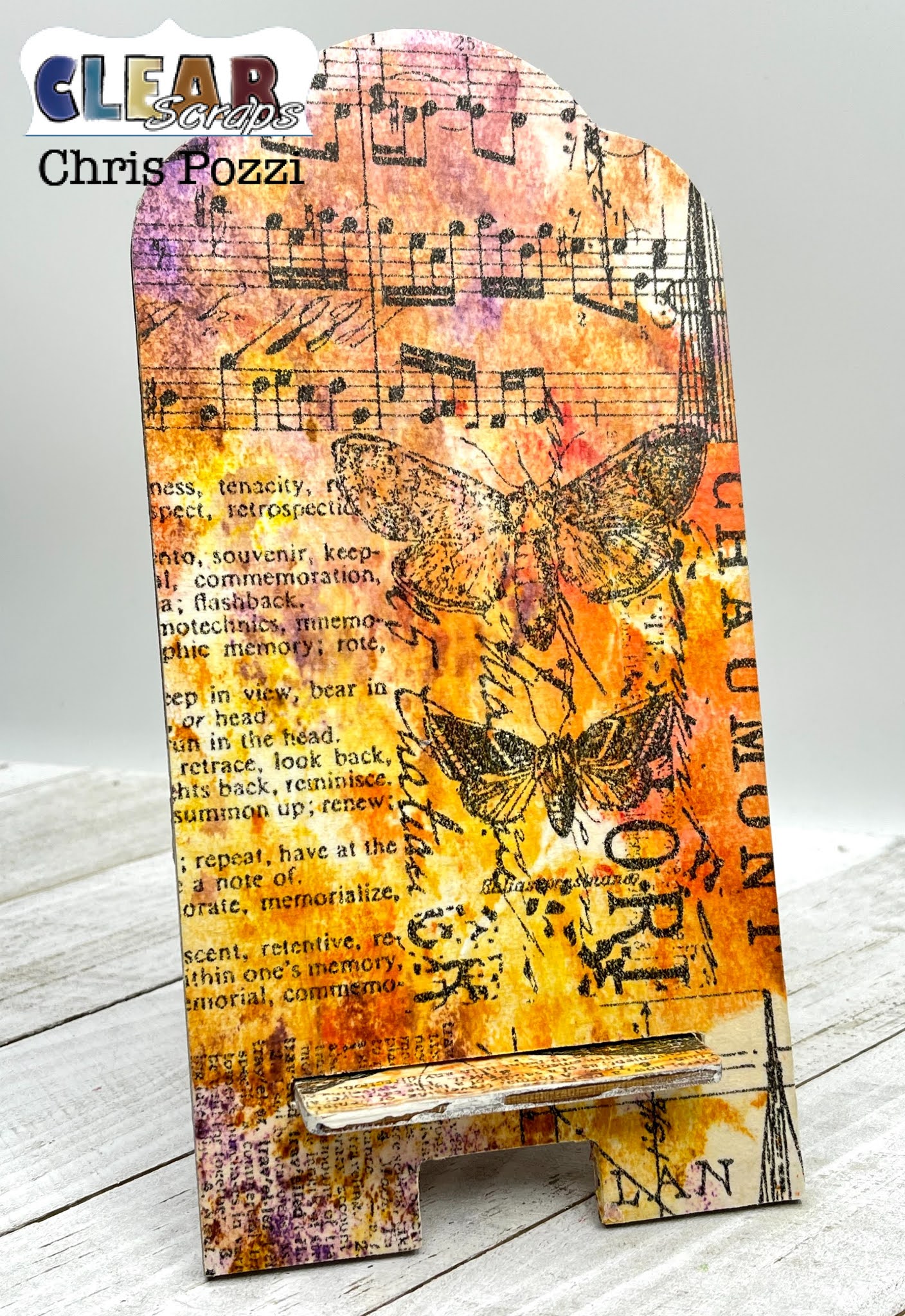 Adhere another piece of tissue paper to the opposite side of your Clear Scraps Vintage Wood Phone Stand. Apply a layer of mod podge. Once dry, sand edges with your Clear Scraps Small Sanding Stick .
