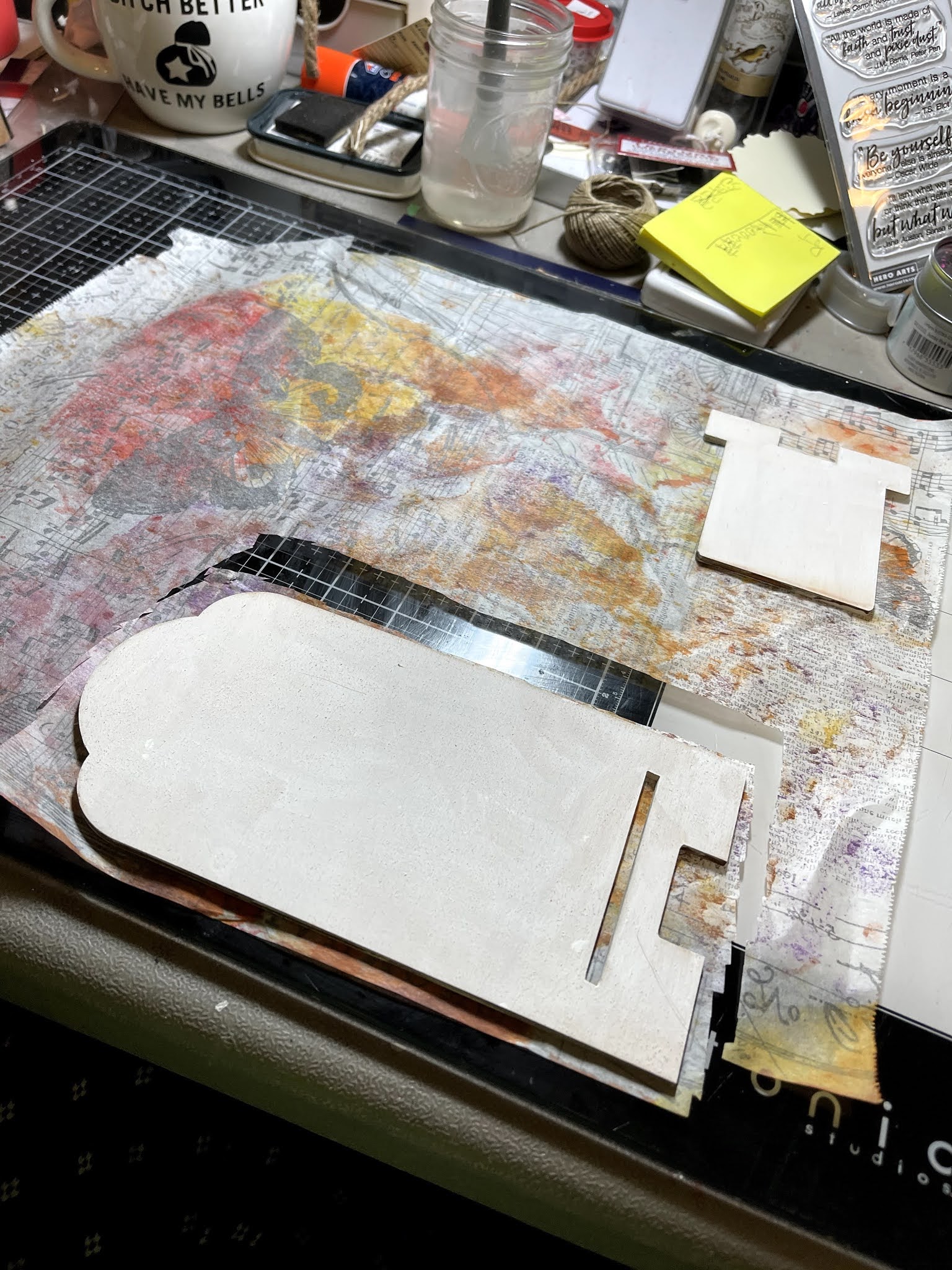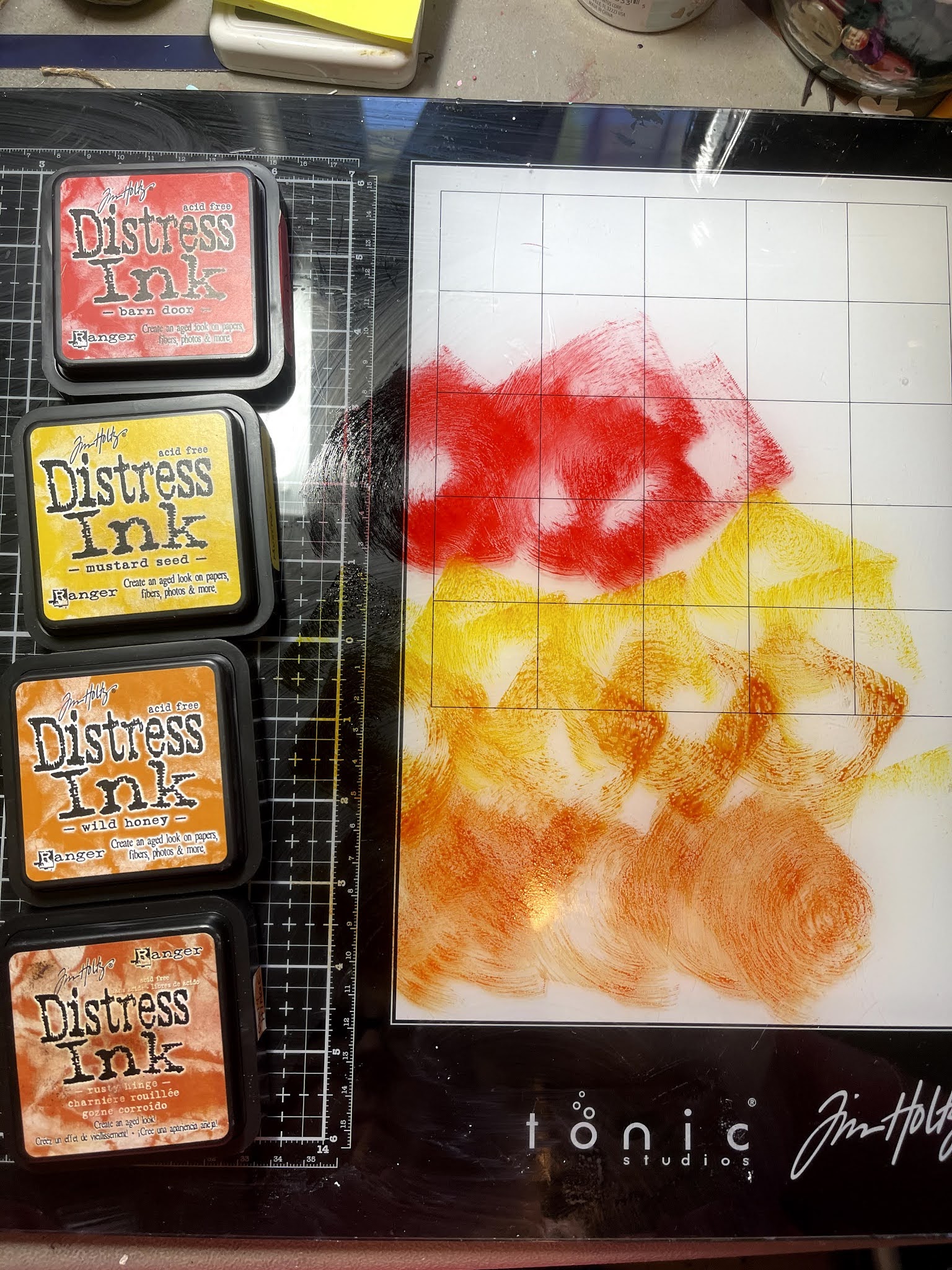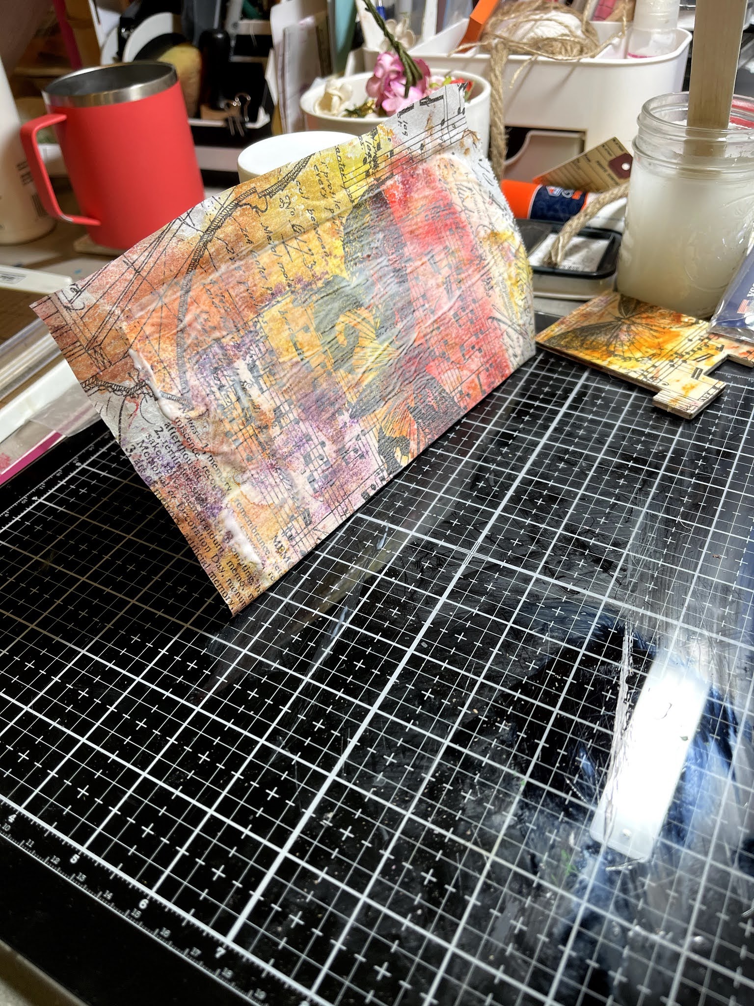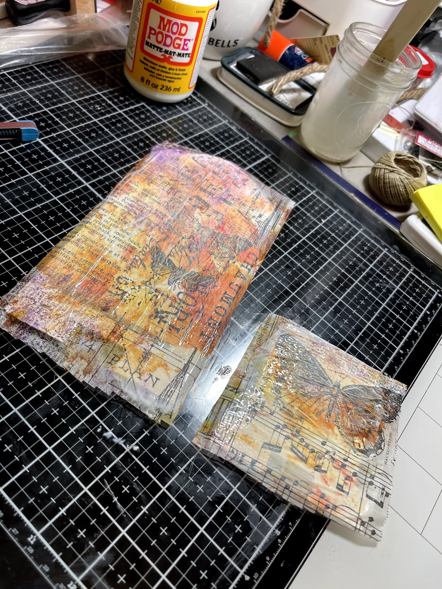 Paint, mod podge, printed tissue paper, distress inks