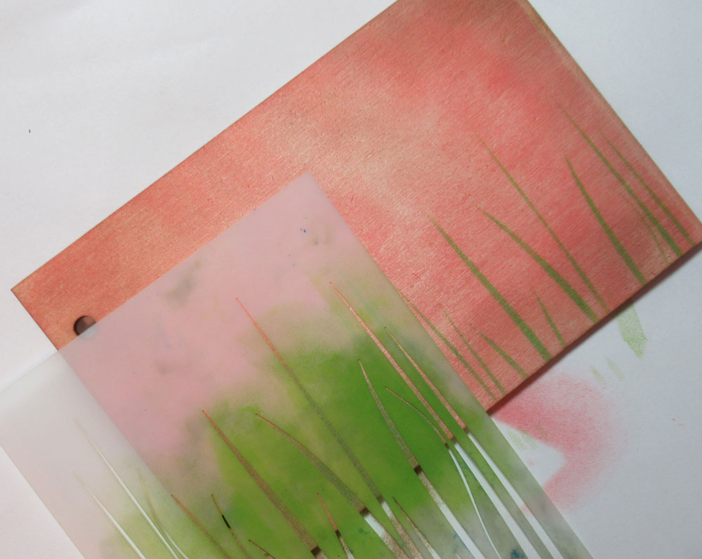 The panels were inked (but also could have been painted) with coral ink. Once dry, I used the 4×6 Grass Stencil with green ink along the bottom of the panel, moving the stencil across the panel so I had full grass coverage.