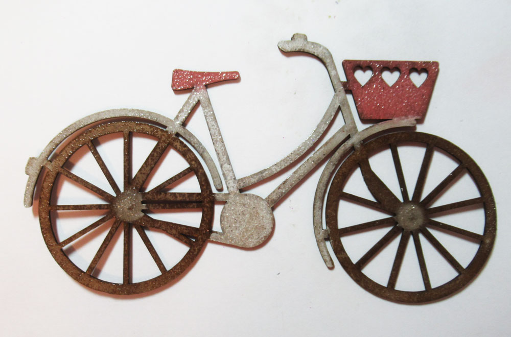 The Bike with Basket Chipboard Embellishment was inked in an assortment of colors, then embossed/heat set.