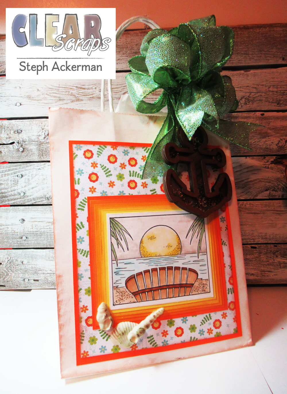 Hi everyone, with summer in full swing, and visits with family and friends ongoing, take a small gift with you in a personalized summer gift bag. You can create a new gift bag or upcyle a gift bag by using one of Clear Scraps' Shakers.