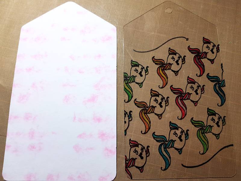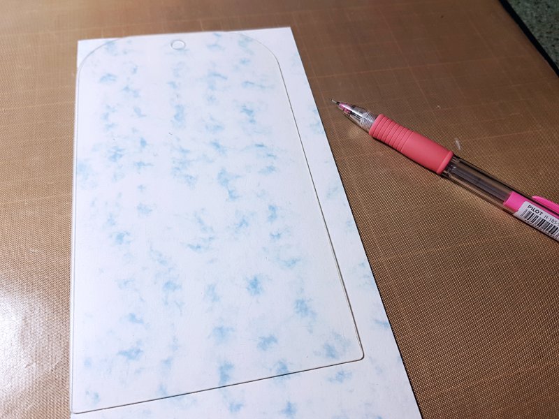 ▼ Laying the acrylic tag on the folded paper, I traced the tag shape with a pencil and cut it out with scissors.