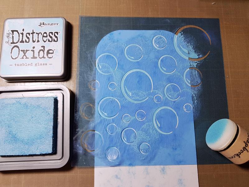▼ On one of the cards, I added bubbles to the card base by using the 6 inch Bubbles Mascil along with Distress Oxide ink (tumbled glass).
