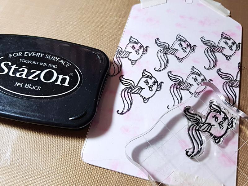 ▼ All Clear Scraps Acrylic has a protective film on both sides so be sure to remove it before stamping or painting! Using Staz On ink in black, I stamped the images on the front of the acrylic. The ink will dry relatively fast but you do have to be careful to not smudge your image. By the way, any mistakes can be removed with a non-acetone fingernail polish remover! Then you are ready to re-stamp!