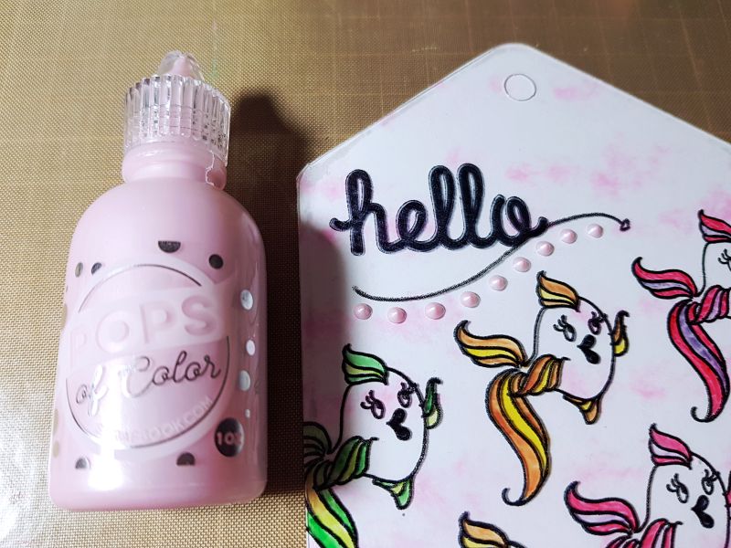 ▼ Removing a protective film on the back of the acrylic tag, I used Zip Dry scrapbook glue to adhere the tag to the card base I cut out. Then, I stamped hello with Staz On ink, added extra touches using pink liquid embellishment, and glued a bow to the top of the card. Last, I painted the borders using acrylic paints along with a paintbrush to finish both cards.