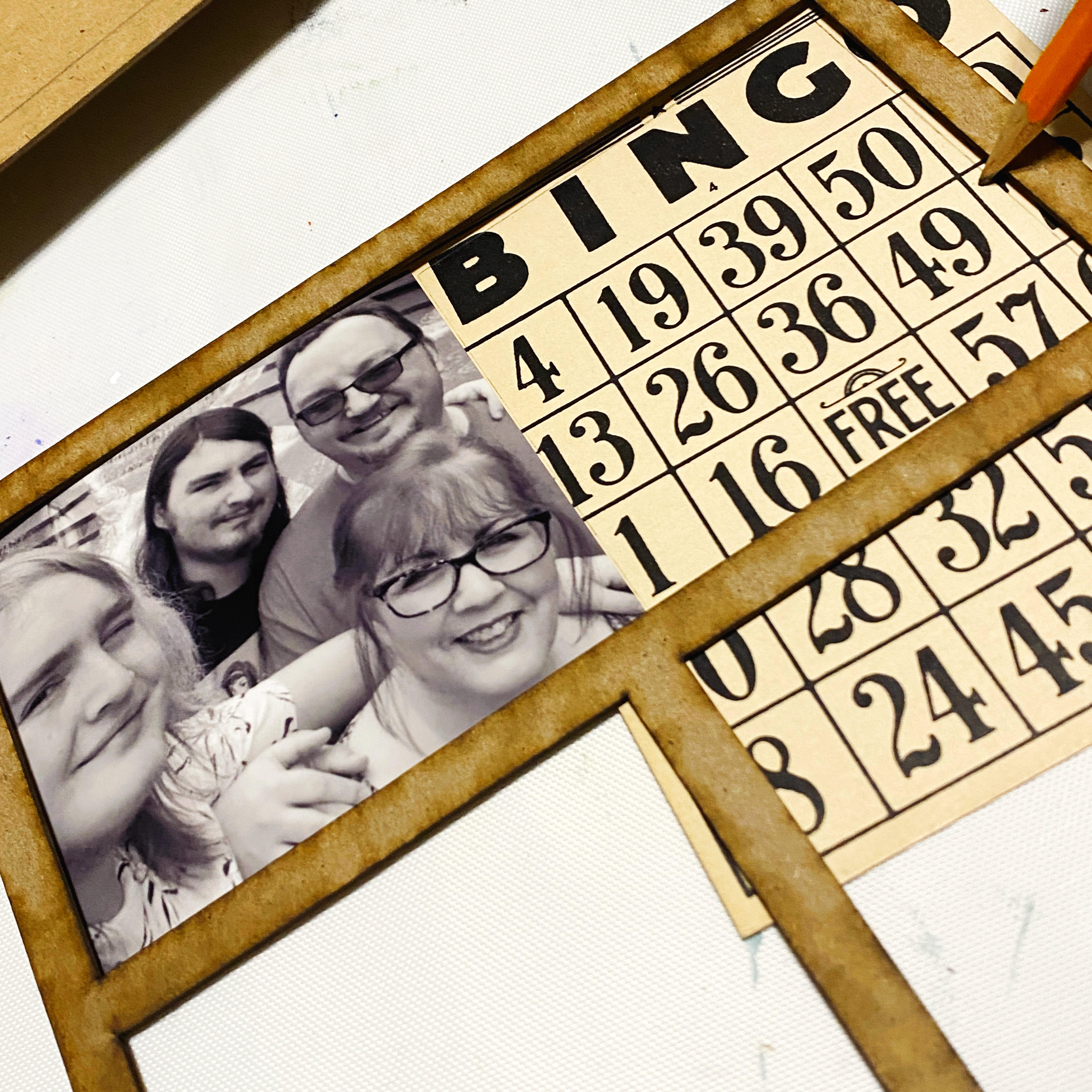 I wanted to incorporate some of my vintage ephemera in the project. One of the items I had selected was a Bingo card. I wanted to use it fill in the rectangular space at the top left of the frame as my photo was not large enough on it's own. I placed the photo and the card in the window and played with the placement until I was happy with it. I then traced lightly around the frame onto the bingo card so I'd know where to cut it…