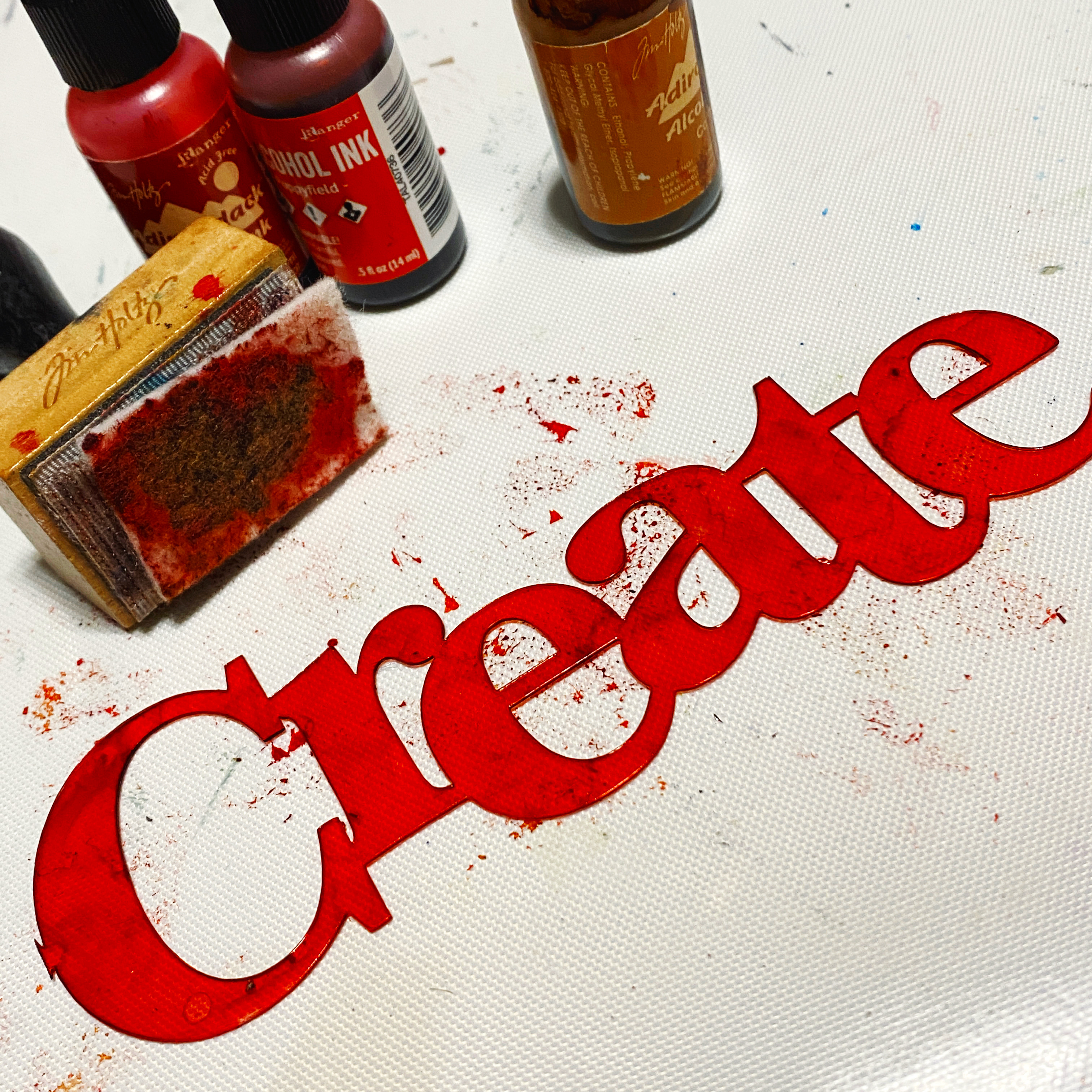 I had decided to place "Create Memories" down in the bottom right rectangle. I had a Clear Scraps acrylic Expressions Clear Word Title to use for "Create" and I wanted to use alcohol inks to color it. I started on the backside and placed drops of 2 colors of red and a bit of brown, then let the inks dry…