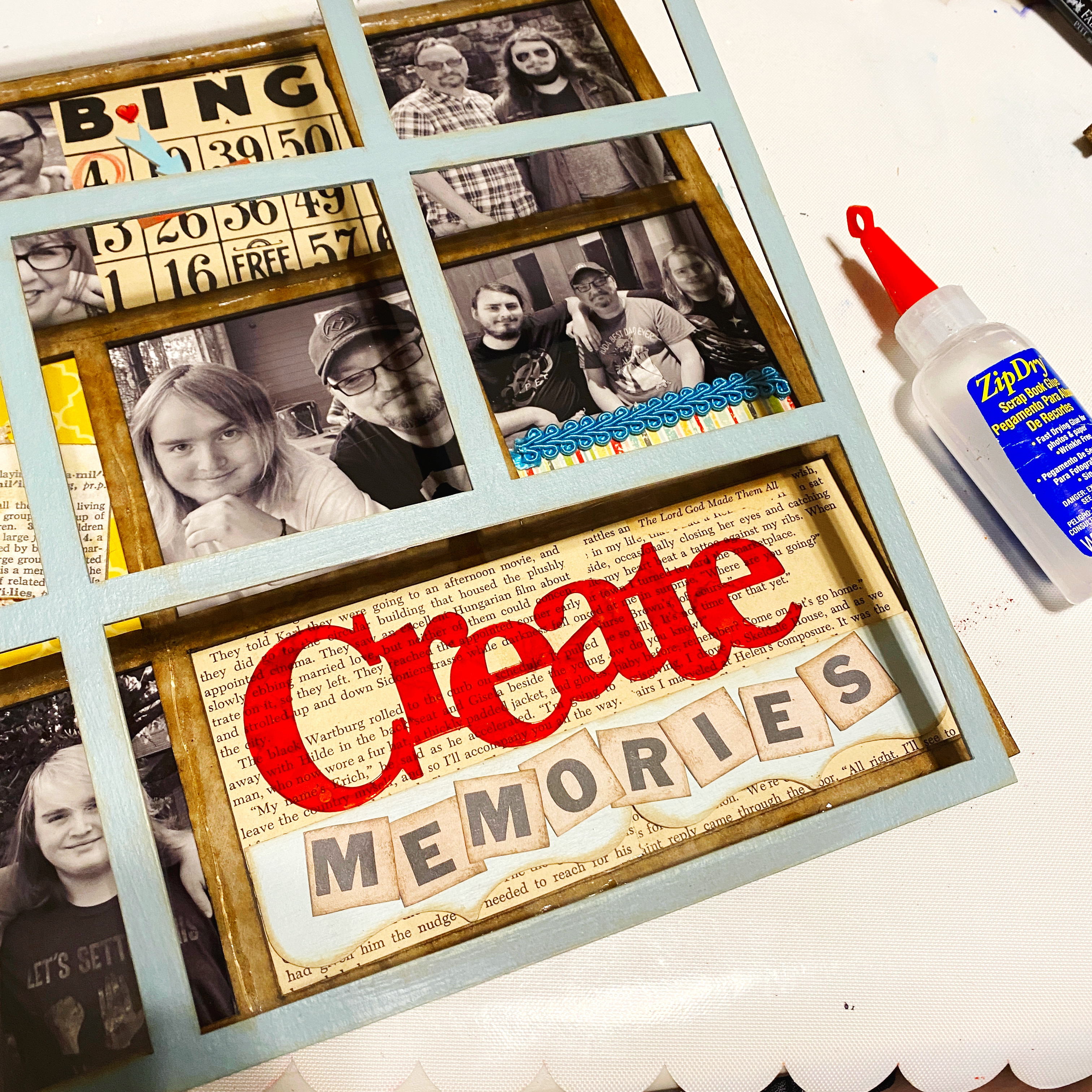 I added papers, vintage book pages and a few other bits to complete the design. Keep in mind that anything you put in each opening shouldn't be any thicker than the 2 additional layers of chipboard frame pieces.