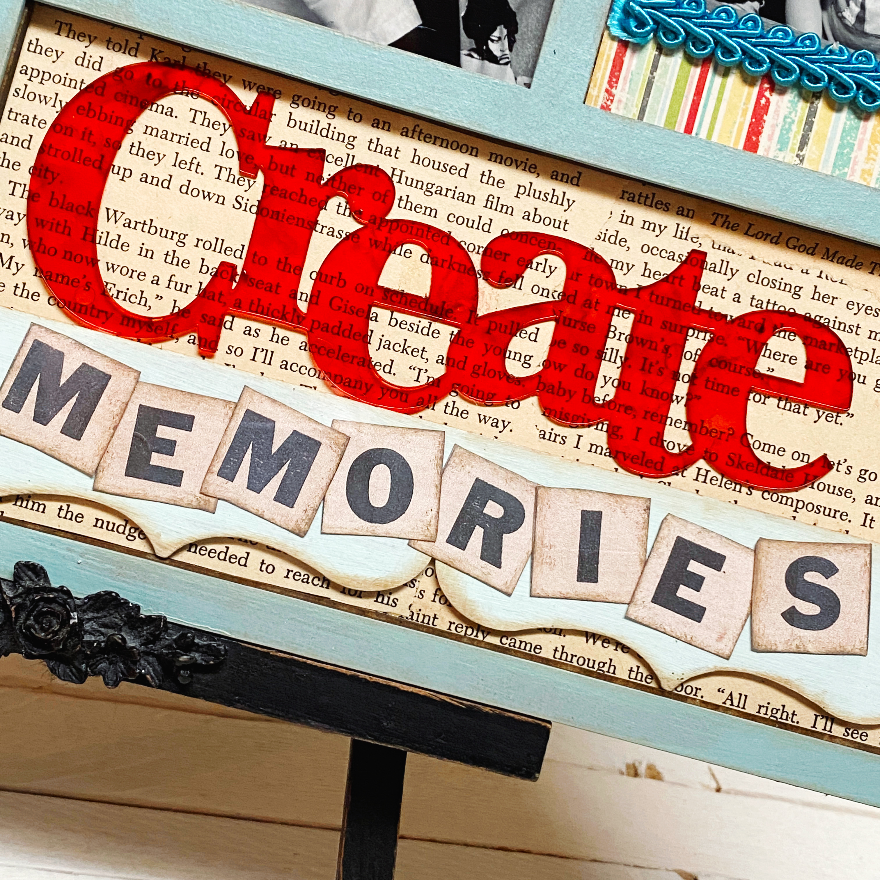 For my title piece, I adhered some book pages to the back piece, then added the painted border and acrylic create word. For the "memories", I scanned, printed and cut out some vintage letters I had…