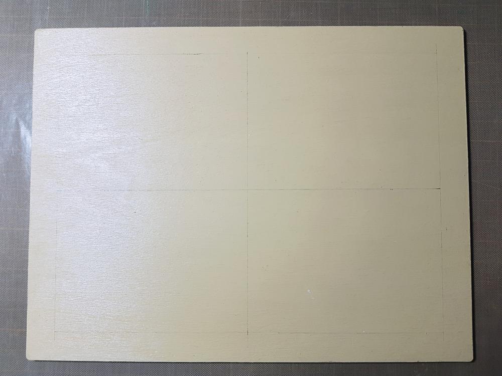 ▼ I started by painting the rectangle wood shape with cream yellow acrylic paint along with a paint brush. After the first coat was dry, I give it another coat of paint. Then I used a ruler and a pencil to draw out four frames.