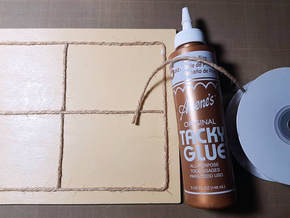 ▼ Here I adhered twine pieces to the wood shape using tacky glue by following the line I drew.
