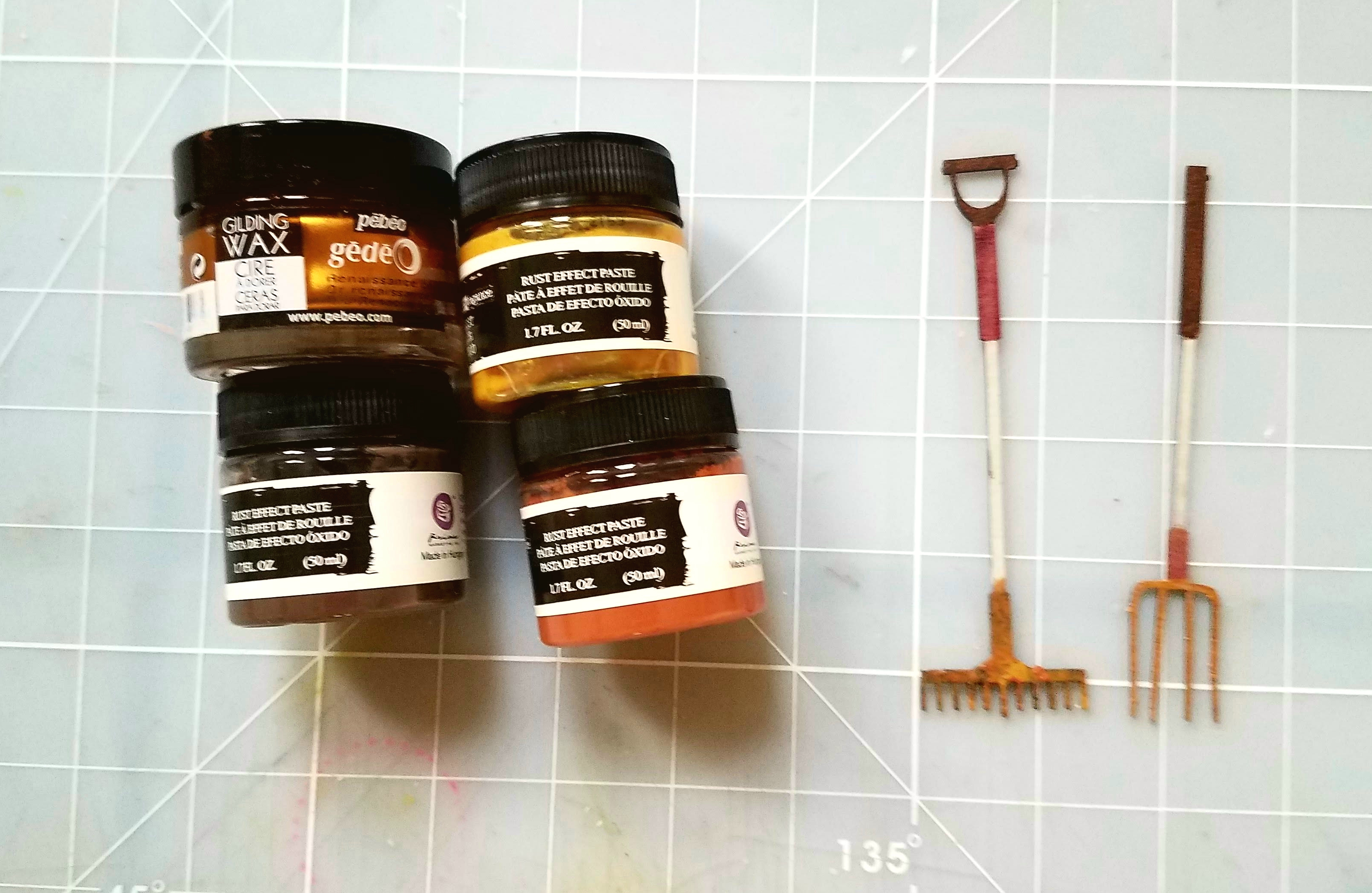 Take and cut apart two of the garden tools chipboard pieces. I chose to use a rake and pitch fork. You can save the other pieces for another project. I painted the handles of my tools with brown and Tuscan red paint. I rubbed some gliding wax (renaissance gold) over my pitch fork spikes. For the bottom of my rake I applied rust pastes to give a rusty worn look to my tools. Let dry. Then glue the tools where you prefer onto your tray.