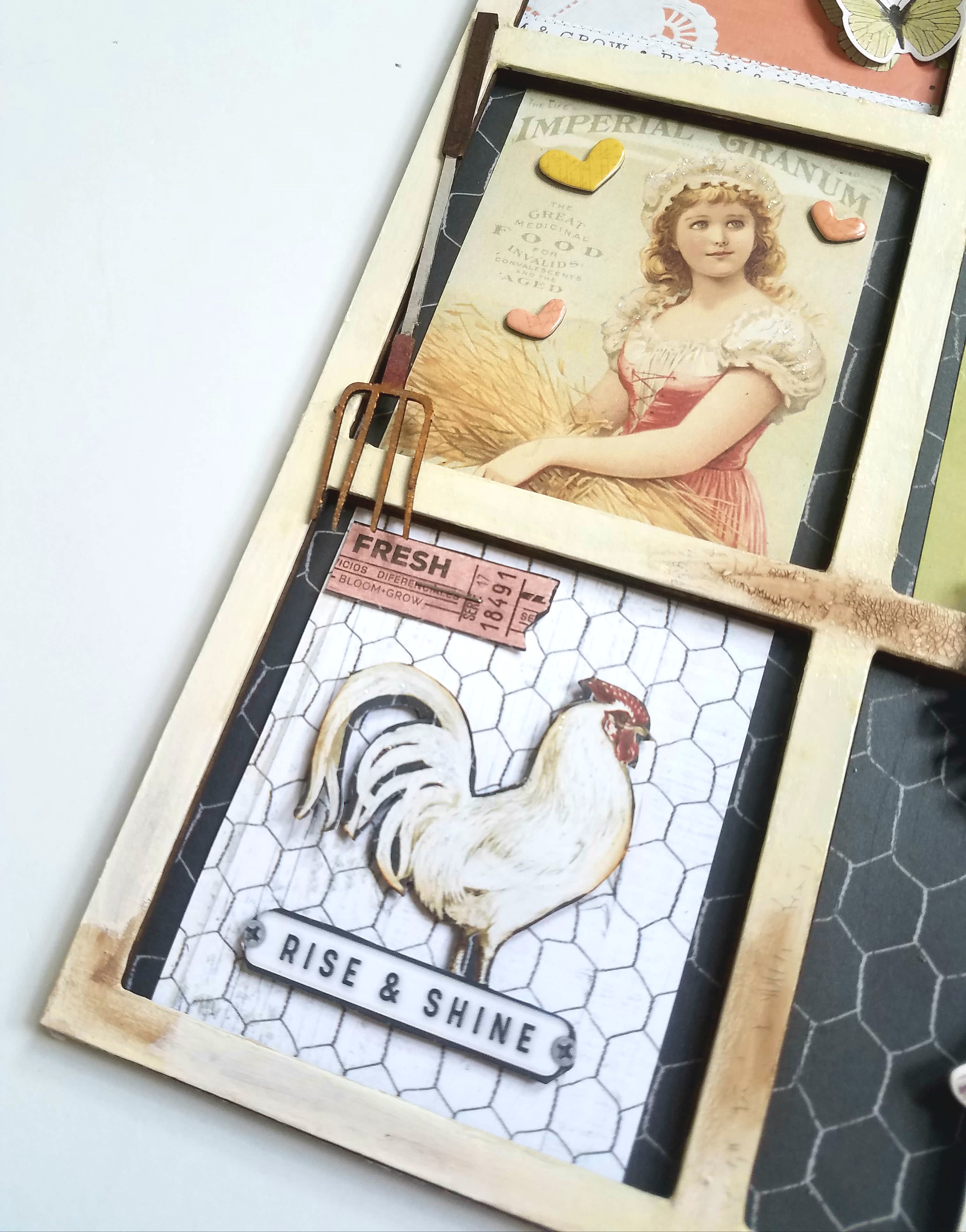 Now cut apart some of the journaling cards from the paper collection and cut to fit inside the sections of your tray. Glue the top chipboard piece on top of your tray. The I adhered one of the chipboard elements (barn) onto the bottom right two sections of my tray. I took the matching ephermera piece with the cow and animals and applied over my matching image on the barn with foam dots. Then added a ephermera sentiment on top.