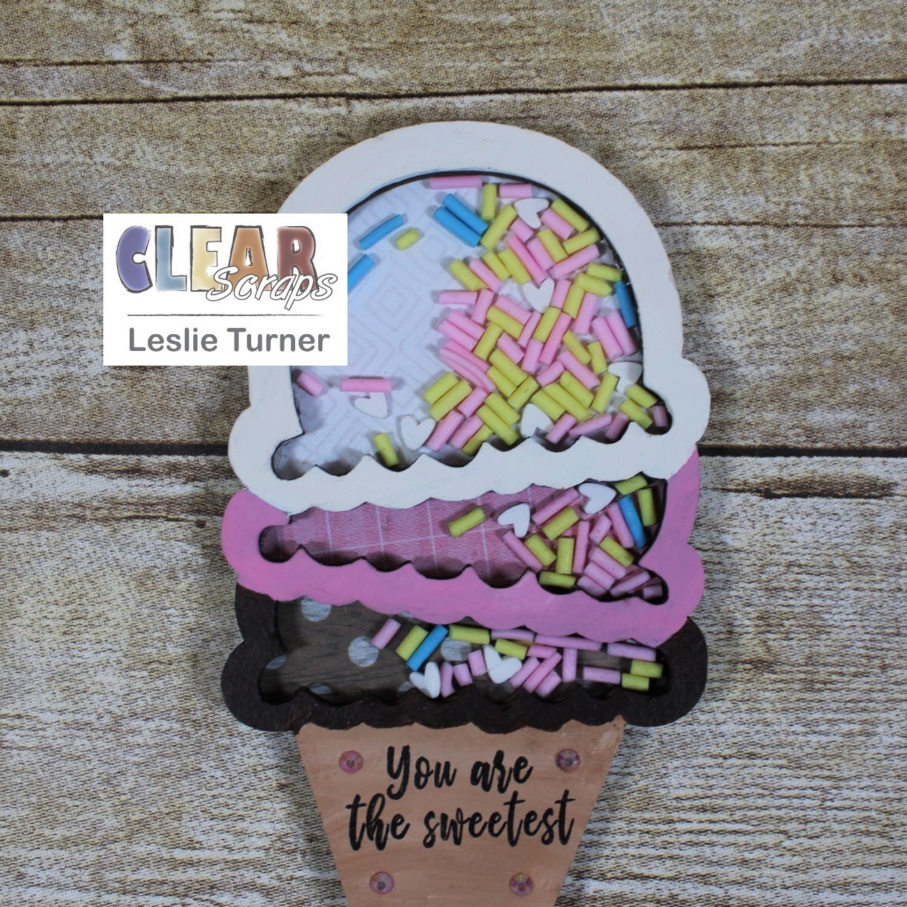 Working from the bottom up, I glued the second and third layers together and glued them to the back. I added the Sprinkles Baby Confetti to all three compartments, and removed the protective film from the back side of the acrylic piece and glued it down, trapping the shaker filler inside. I removed the protective film from the front side of the acrylic piece and glued the painted top layer down. I stamped the 'sweet' sentiment in black solvent ink and added several iridescent gemstones.