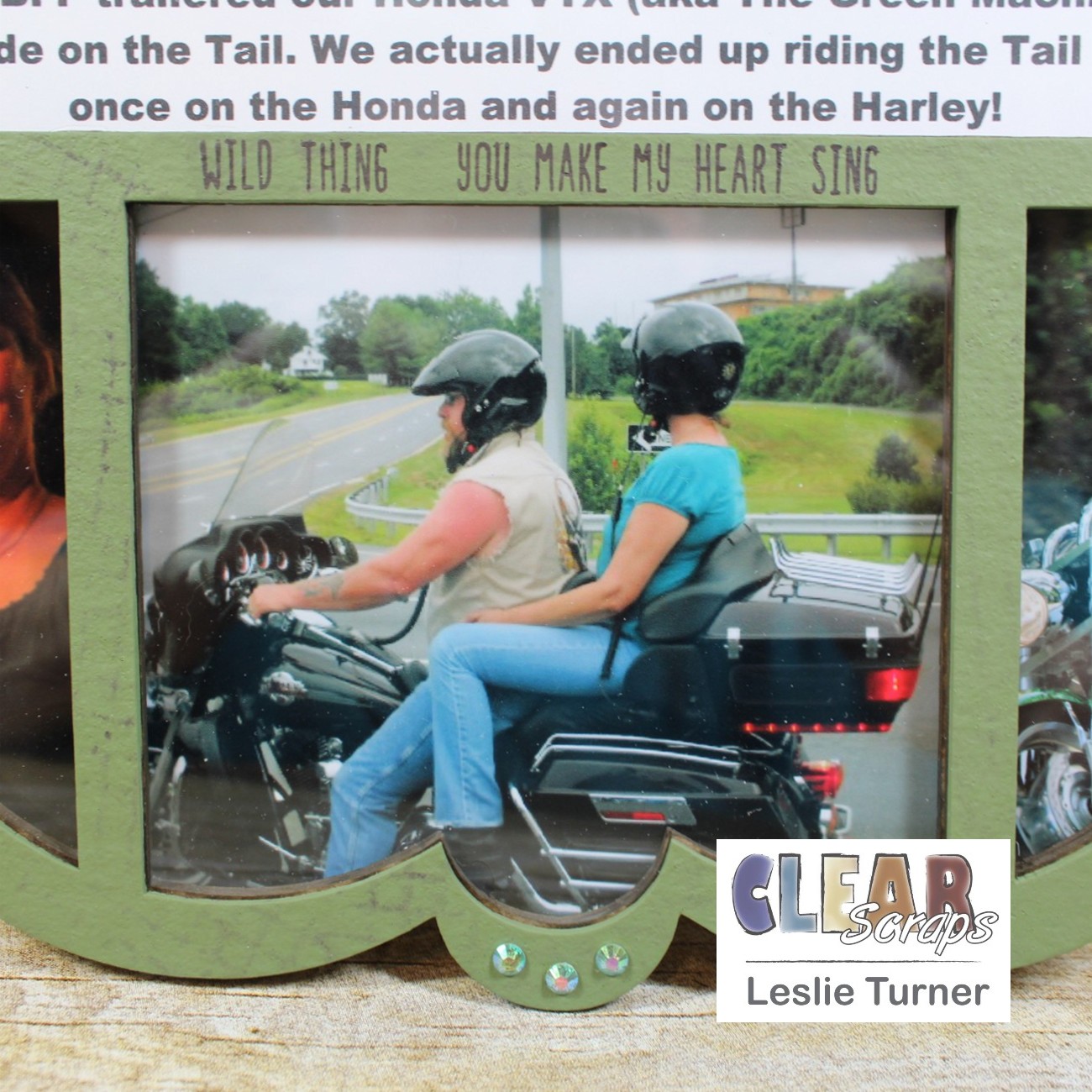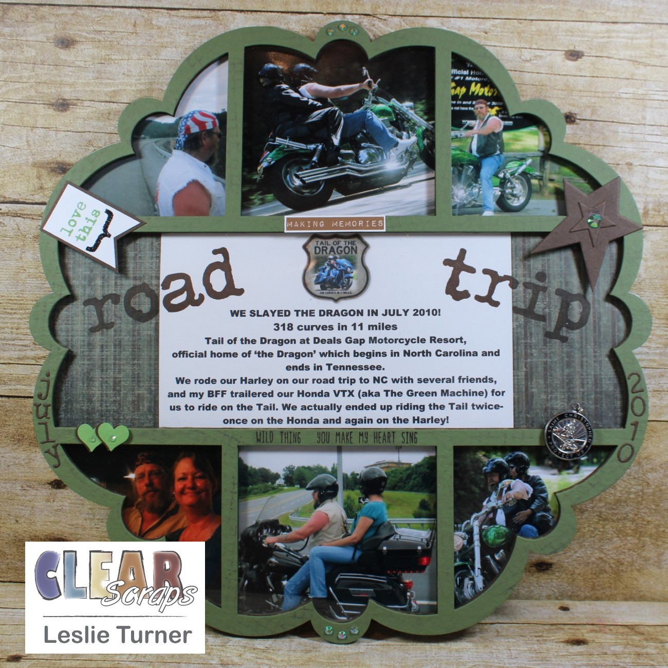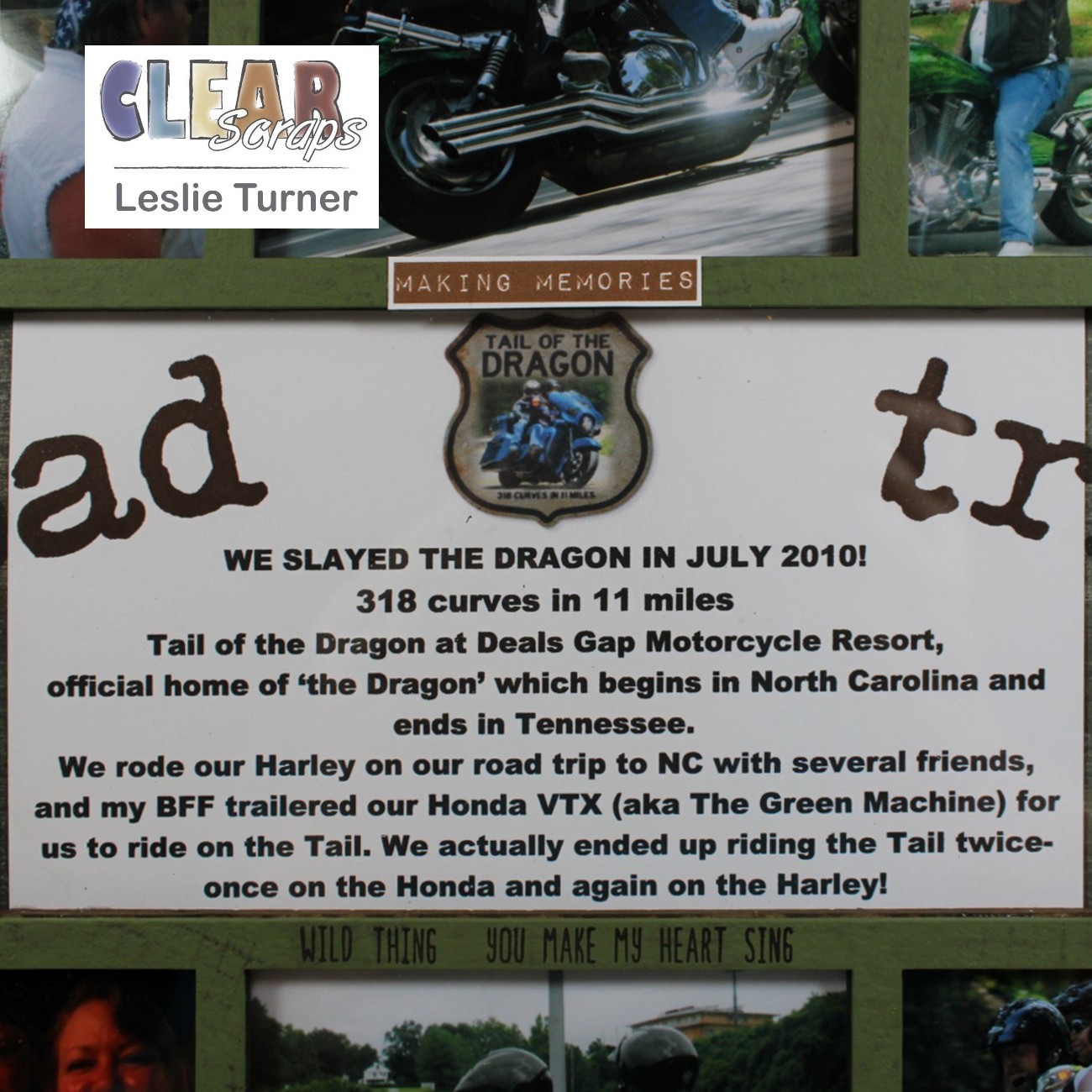 Hey, everybody! Leslie here, sharing a project documenting a road trip to Deals Gap Motorcycle Resort with a group of friends back in July 2010. I used the Scallop Circle Printer Tray Frame which I painted with green chalk paint. Hubby and I rode the Tail of the Dragon twice on two different motorcycles. We rode the Harley on our road trip with our friends, and my best friend from high school and college trailered our Honda VTX so we could ride it on the Tail also. What fun we had! This printer tray frame is the perfect product to document our amazing trip!