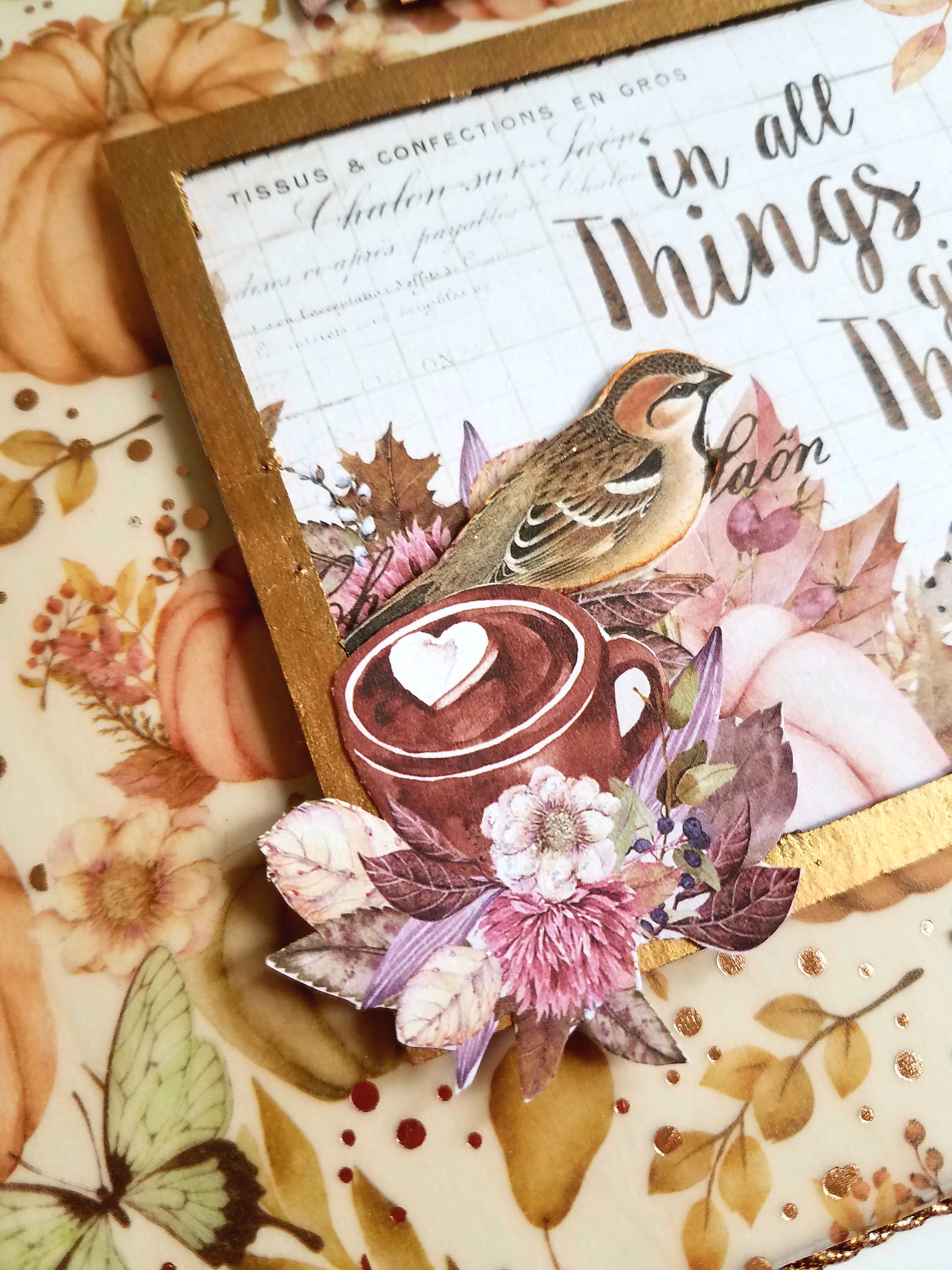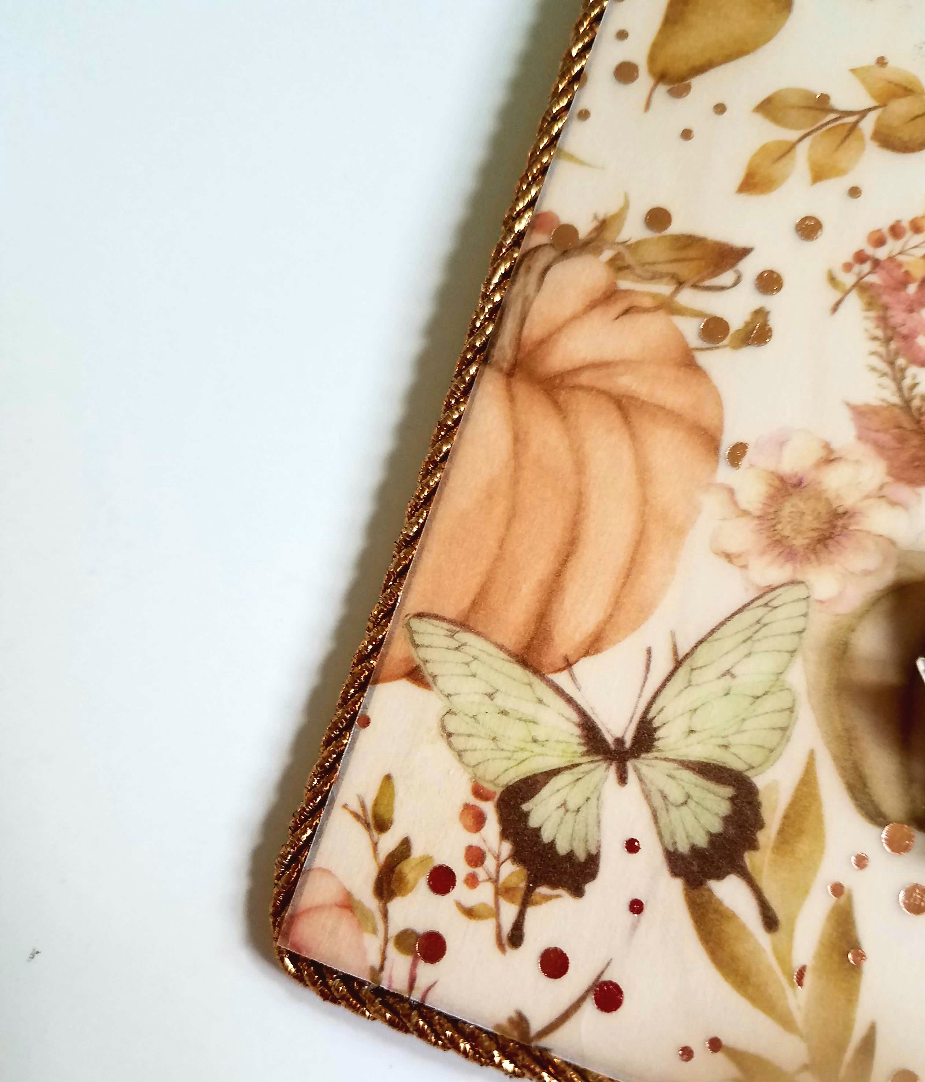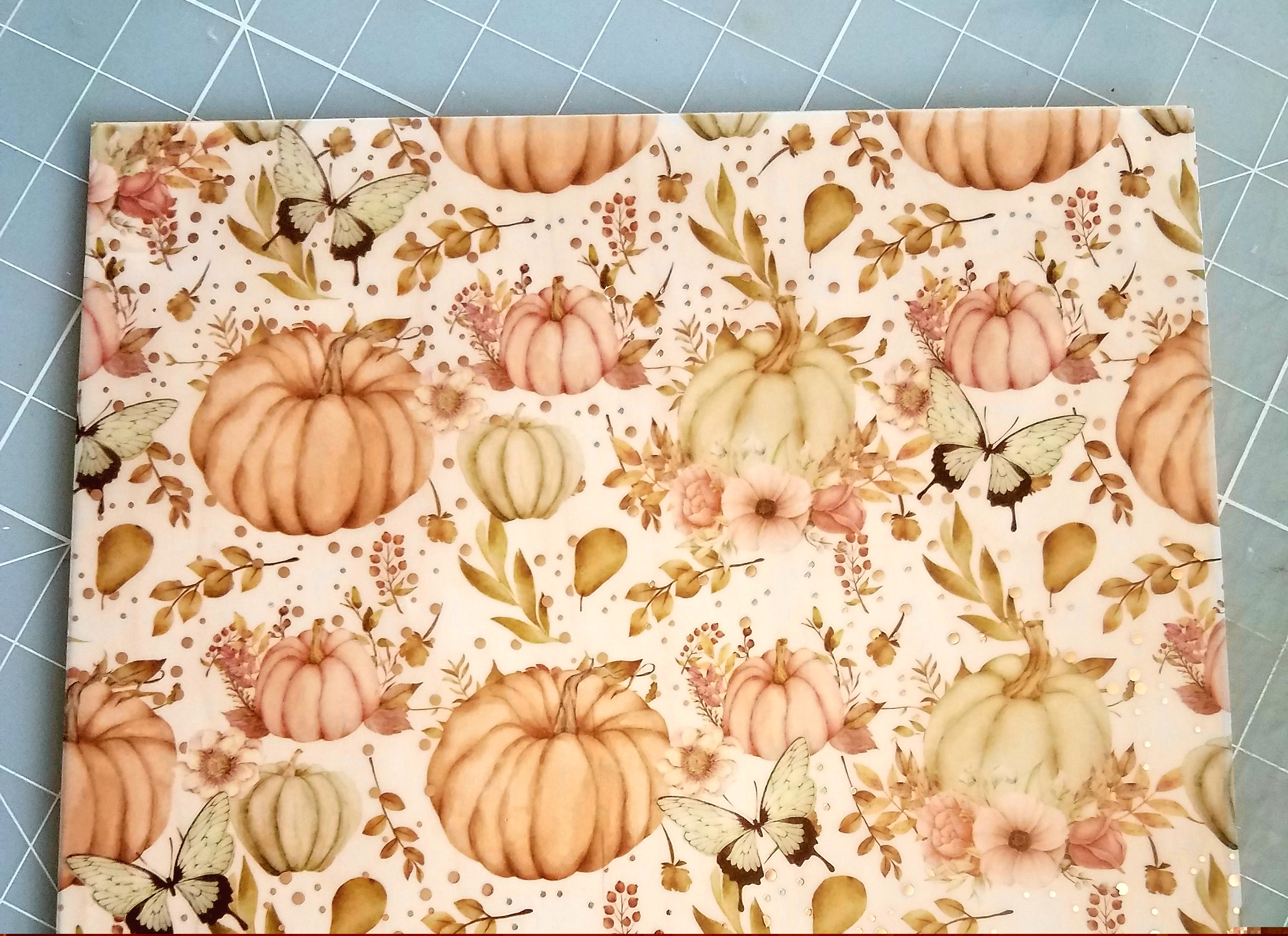 For my project today, I chose to cover my wood rectangle with a vellum sheet with foil accents. The collection I'm using today is Prima's new Pink Autumn collection. I cut my vellum sheet to measure 10 x7 7/8 inches. I used a Clear vellum adhesive or any clear glue you prefer.